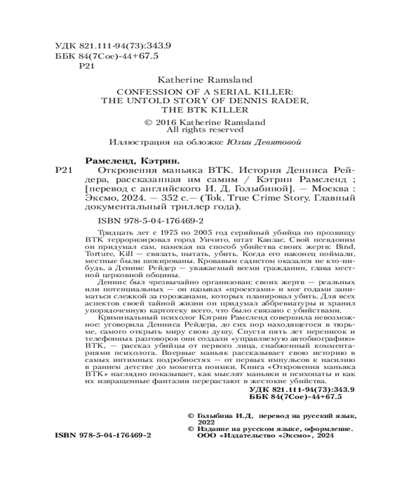 Серия: Tok. True Crime Story. Главный документальный триллер года Автобиография маньяка BTK, вдохновившего Томаса Харриса и Стивена Кинга. Впервые убийца сам рассказывает о своих преступлениях и о том, что его побудило убивать.