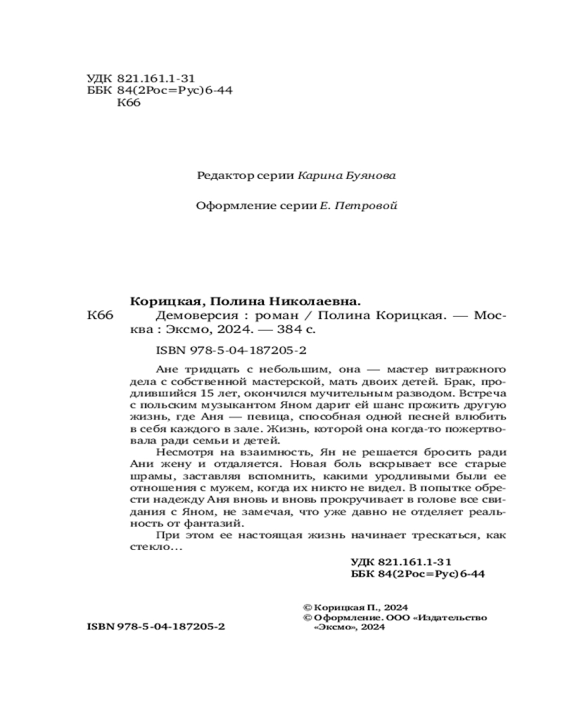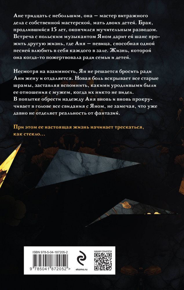 💳 Оплатить за товар можно при получении 🇰🇿 Есть бесплатная доставка по Казахстану от 1 дня 🎁 Копите бонусы с каждой покупки Серия: Это личное. Психологический роман Ане тридцать с небольшим, она — мастер витражного дела с собственной мастерской, мать двоих детей. Брак, продлившийся 15 лет, окончился мучительным разводом. Встреча с польским музыкантом Яном дарит ей шанс прожить другую жизнь, где Аня — певица, способная одной песней влюбить в себя каждого в зале. Жизнь, которой она когда-то пожертвовала ради семьи и детей. |