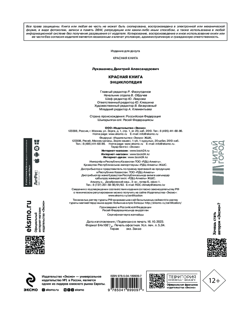 Красная книга. ЭнциклопедияДмитрий Александрович Лукашанец В данный момент этот товар отсутствует в продаже. Возможно, у нас найдется аналогичный или похожий товар здесь. Серия: Красная книга Красная книга мира собрала под своей обложкой самых редких, удивительных, и, увы, исчезающих видов животных нашей необъятной планеты. Природные катаклизмы, загрязнение окружающей среды, истребление человеком — все это приводит к тому, что многие виды животных могут просто исчезнуть с поверхности Земли. В нашей книге собрана очень интересная информация о таких представителях фауны, которым грозит опасность исчезновения. |