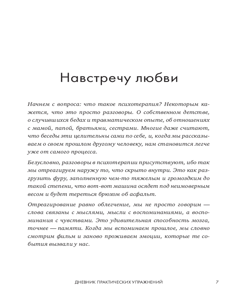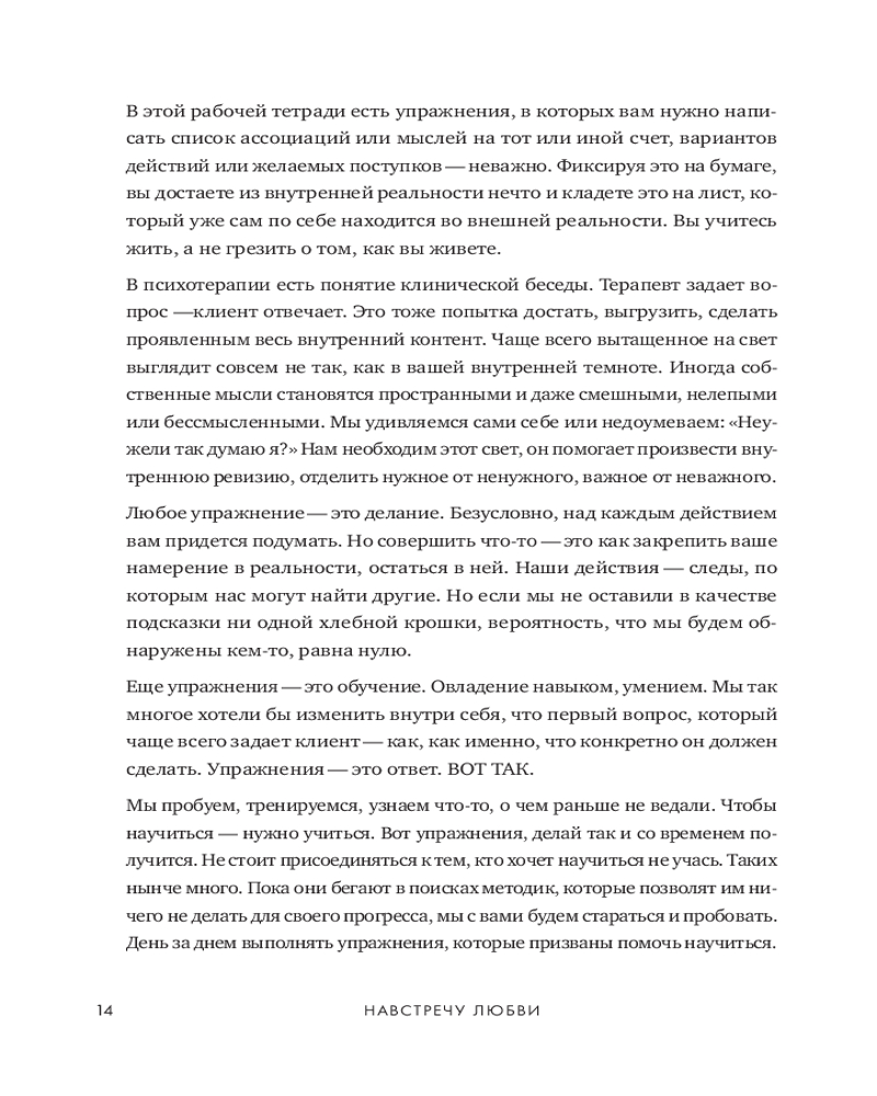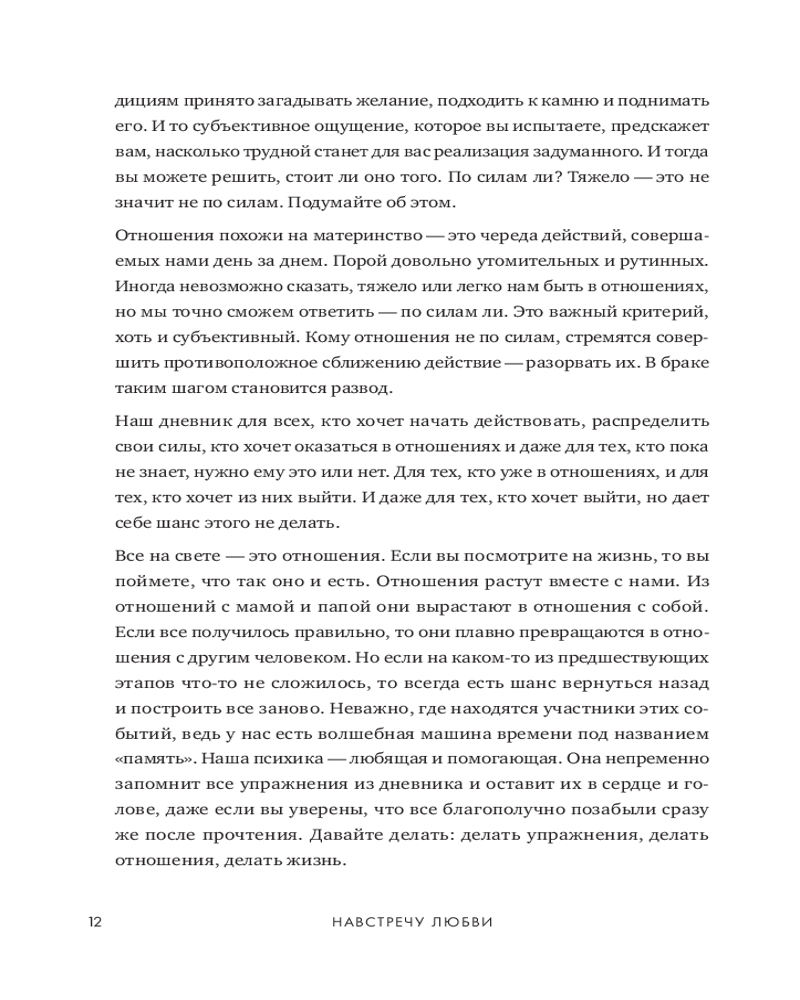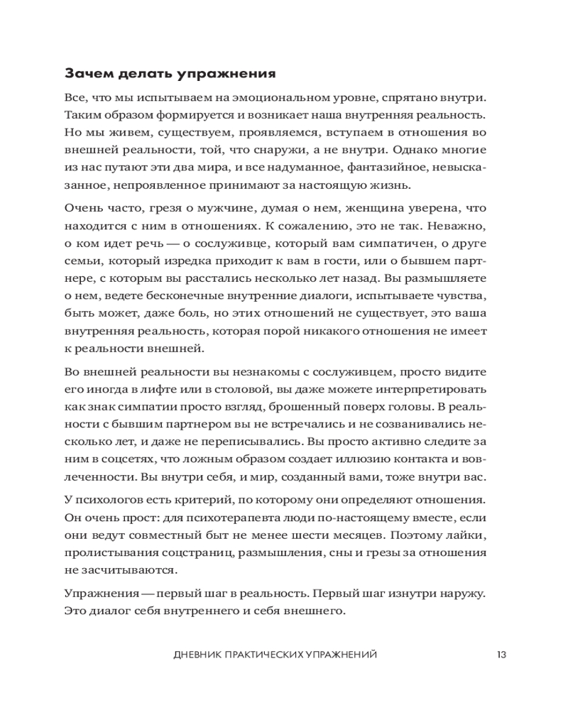 «Наш дневник для всех, кто хочет начать действовать, кто хочет оказаться в отношениях, и даже для тех, кто пока не знает, нужно ему это или нет. Наша психика — любящая и помогающая. Она непременно запомнит все упражнения и оставит их в сердце и голове, даже если вы уверены, что все благополучно позабыли сразу же после прочтения. Давайте делать: делать упражнения, делать отношения, делать жизнь». — Ирина Семизорова.