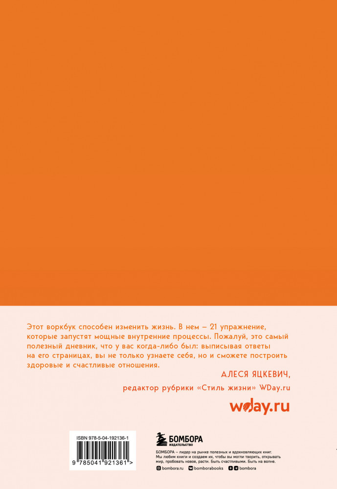 «Этот воркбук способен изменить жизнь. В нем — 21 упражнение от психолога, которые запустят мощные внутренние процессы. Пожалуй, это самый полезный дневник, что у вас когда-либо был: выписывая ответы на его страницах, вы не только узнаете себя, но и сможете построить здоровые и счастливые отношения». — Алеся Яцкевич, Редактор рубрики «Стиль жизни» WDay.ru. |
