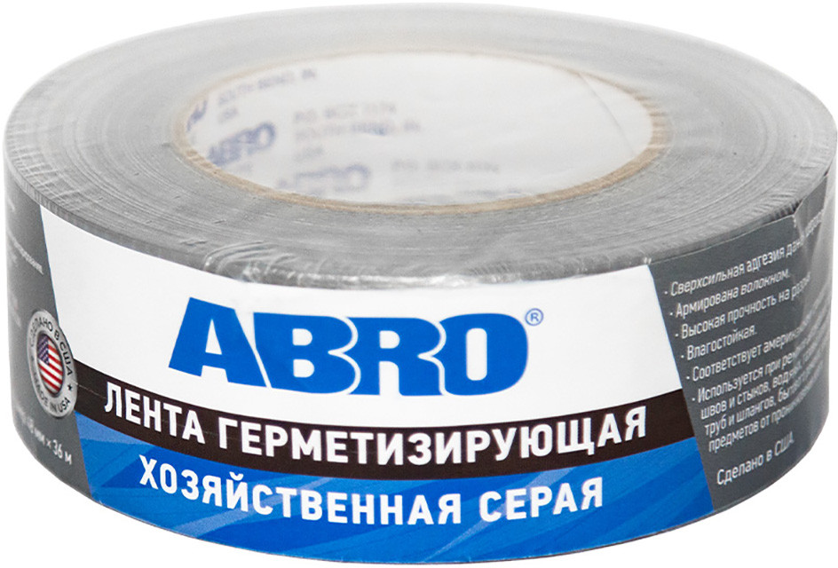 Лента герметизирующая Abro хозяйственная серая — сверхлипкая хозяйственная лента серого цвета из полиэтилена, армированная волокном. Сфера применения: ремонт автомобилей, герметизация швов и стыков, водяных, газовых и вентиляционных труб и шлангов, бытовой ремонт, упаковка и защита предметов от проникновения влаги, маркировка.