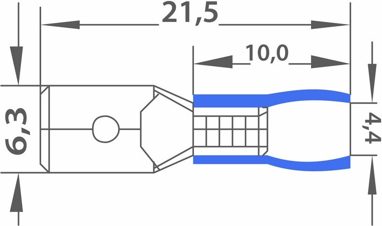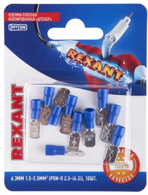 Клемма плоская изолированная Rexant 2.5-(6.3)/РпИп 2-6-0,8 штекер 6.3 мм 1.5-2.5 мм², синий, блистер — предназначена для создания качественного подключения электрооборудования или соединения проводов между собой, которое при необходимости возможно разъединить без лишних усилий. Такая клемма используется для оконцовывания многожильных медных проводов при монтаже мобильных электрических контактных соединений на подвижном составе (автомобиле-, вагоно-, самолето- и судостроении). Изолированная плоская клемма Rexant состоит из двух компонентов: металлического коннектора (штекер) и защитного изолятора. Металлический коннектор изготовлен из латуни, с поверхностным электролитических лужением, а изолятор клеммы из поливинилхлорида (ПВХ), который надежно защищает место обжима кабеля. Обжатие производится специальными пресс-клещами поверх защитного изолятора. Каждая клемма имеет отверстие, служащее фиксатором замкового типа для более прочного механического соединения с гнездовым разъемом.