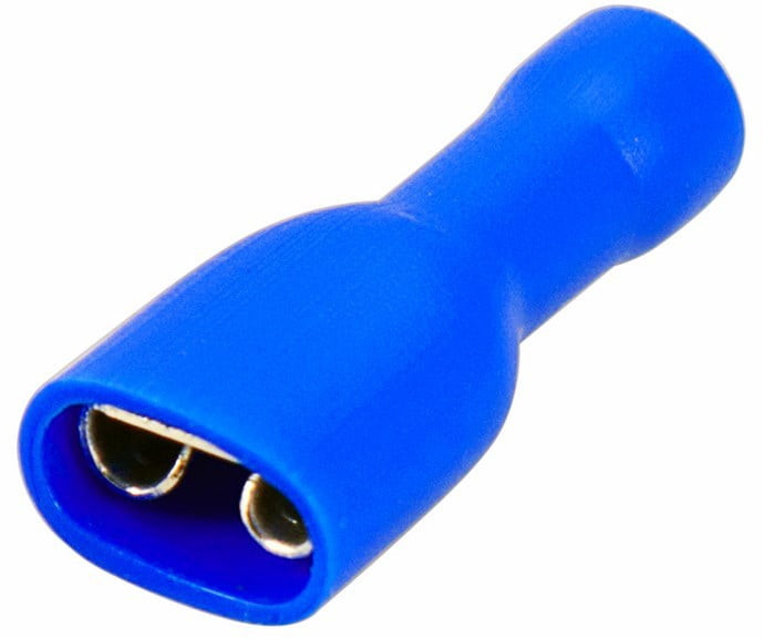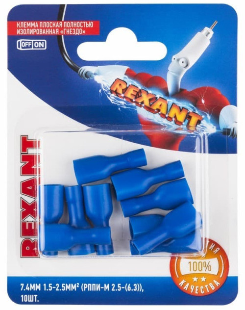Клемма плоская полностью изолированная Rexant 2.5-(6.3)/РпИмп 2-250 гнездо 6.6 мм 1.5-2.5 мм² — предназначена для создания качественного подключения электрооборудования или соединения проводов между собой, которое при необходимости возможно разъединить без лишних усилий. Такая клемма используется для оконцовывания многожильных медных проводов при монтаже мобильных электрических контактных соединений на подвижном составе (автомобиле-, вагоно-, самолето- и судостроении). Изолированная плоская клемма Rexant состоит из двух компонентов: металлического коннектора (штекер) и защитного изолятора. Металлический коннектор изготовлен из латуни, с поверхностным электролитических лужением, а изолятор клеммы из поливинилхлорида (ПВХ), который надежно защищает место обжима кабеля. Обжатие производится специальными пресс-клещами поверх защитного изолятора. Каждая клемма имеет отверстие, служащее фиксатором замкового типа для более прочного механического соединения с гнездовым разъемом.