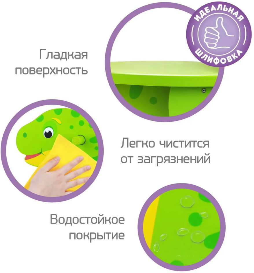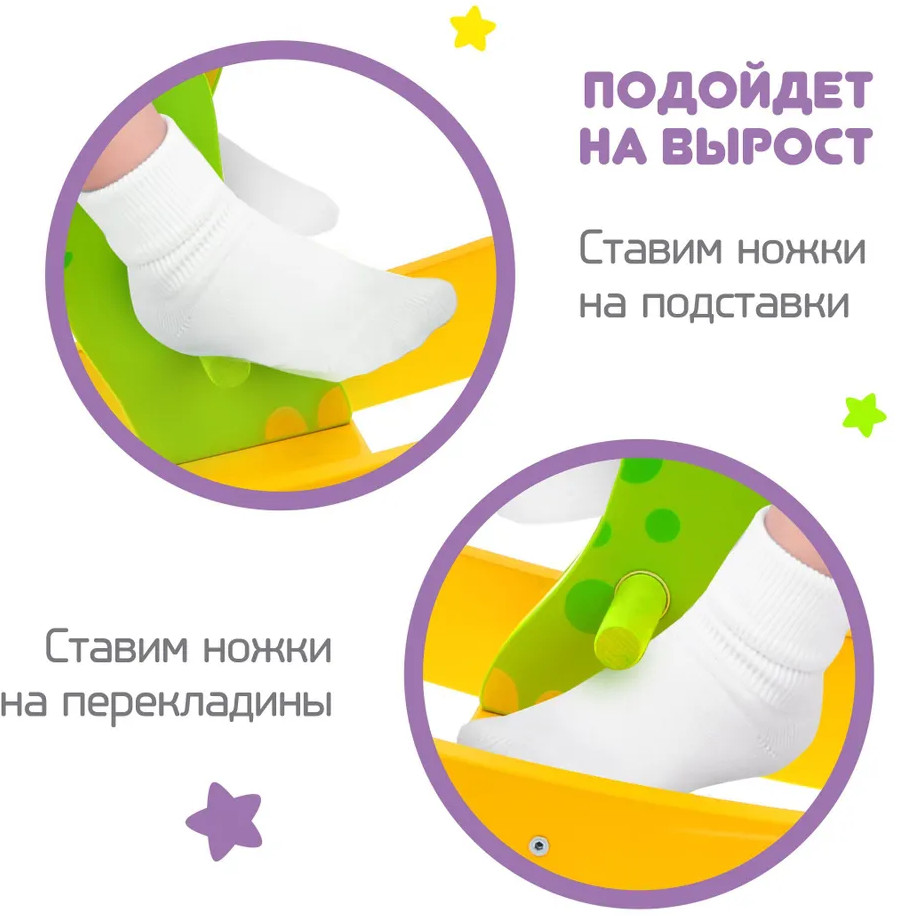 У качалки гладкая поверхность — каждая ее деталь тщательно отшлифована. Водостойкое покрытие позволяет легко очистить изделие от загрязнений, в чем заключается его несомненное преимущество перед мягкими качалками. Данная модель подойдет на вырост: пока ребенок маленький, он может ставить ноги на специальные подножки. А когда малыш подрастет, ноги можно будет ставить уже на перекладины.