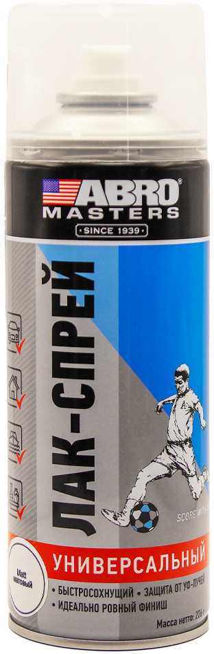 Лак-спрей ABRO MASTERS — универсальный быстросохнущий акриловый лак-спрей. Предназначен для создания финишного защитного покрытия как на окрашенных, так и неокрашенных деталях.