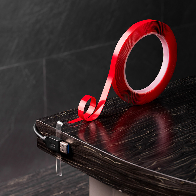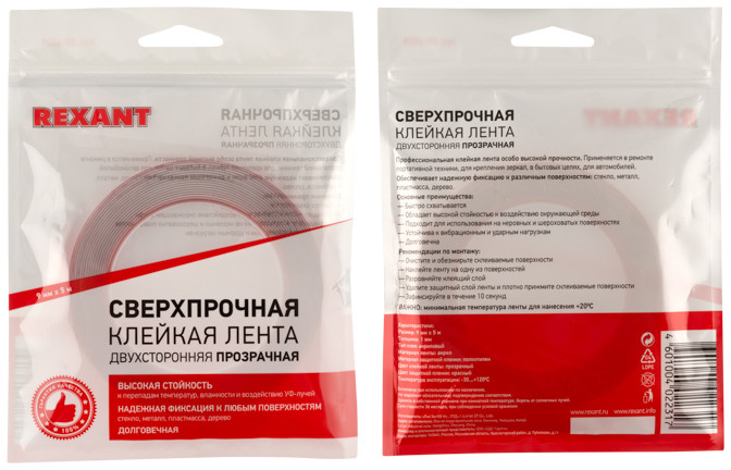 Двухсторонний скотч прозрачный, представляет собой клейкую с двух сторон пластичную ленту. Область его применения не имеет границ. Его используют как для внутренних, так и для наружных работ (в производстве, торговле, искусстве, быту и т. д.). Основой для производства такого скотча служат материалы всемирно известной компании 3M, отличающиеся от остальных сверхвысокой клейкостью и термостойкостью (выдерживает до +130 ℃). Он легко склеит предметы из самых разнообразных материалов, таких как стекло, металл, пластмасса, а также загрунтованное дерево. Сделано из 100 % чистого акрилового клея.Оптимальная температура для работы с лентой в диапазоне +20...+30 ℃ при относительной влажности 50 %. В условиях, когда к клейкой ленте прилагаются значительные (близкие к предельным) нагрузки, следует иметь в виду, что максимальная величина адгезии достигается через 20-24 часа после склеивания предметов. Прозрачная основа позволяет данному типу скотча оставаться незаметным.