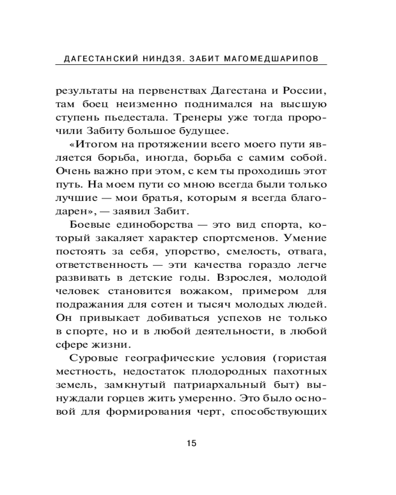 Сам Забит и его личные тренеры убеждены, что только тяжелая работа приносит плоды, и главная задача — быть морально и физически сильнее соперника. Вы читаете реальную историю человека, который в молодом возрасте добился множества наград и уважения. Эта книга для тех, кто ценит жизнь во всех ее проявлениях. Вы узнаете, что привело Забита в спортивную карьеру и какое трудное решение ему пришлось принять в 2022 году. |