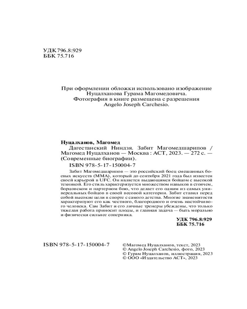 В данный момент этот товар отсутствует в продаже. Возможно, у нас найдется аналогичный или похожий товар здесь. Серия: Современные биографии Забит Магомедшарипов — это российский боец смешанных боевых искусств (MMA), который до сентября 2021 года был известен своей карьерой в UFC. Он является выдающимся бойцом с высокой техникой и множеством побед в легкой и полулегкой весовых категориях. Его стиль характеризуется множеством навыков в стоячем, борцовском и партерном бою, что делает его одним из самых универсальных бойцов в своей весовой категории.