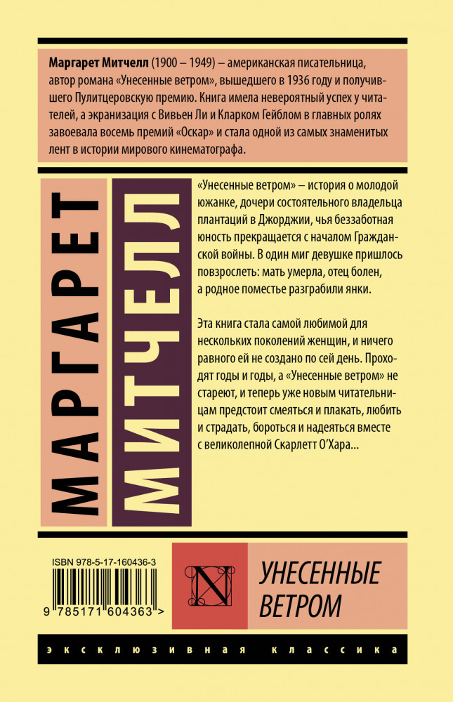 💳 Оплатить за товар можно при получении 🇰🇿 Есть бесплатная доставка по Казахстану от 1 дня 🎁 Копите бонусы с каждой покупки Серия: Эксклюзивная классика (Лучшее) «Унесенные ветром» — история о молодой южанке, дочери состоятельного владельца плантаций в Джорджии, чья беззаботная юность прекращается с началом Гражданской войны. В один миг девушке пришлось повзрослеть: мать умерла, отец болен, а родное поместье разграбили янки. Эта книга стала самой любимой для нескольких поколений женщин, и ничего равного ей не создано по сей день. Проходят годы и годы, а «Унесенные ветром» не стареют, и теперь уже новым читательницам предстоит смеяться и плакать, любить и страдать, бороться и надеяться вместе с великолепной Скарлетт О’Хара... |