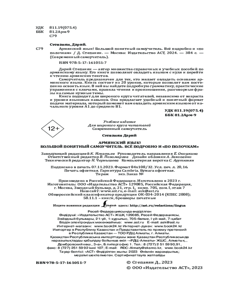 💳 Оплатить за товар можно при получении 🇰🇿 Есть бесплатная доставка по Казахстану от 1 дня 🎁 Копите бонусы с каждой покупки Серия: Современный самоучитель Дарий Степанян — автор множества справочных и учебных пособий по армянскому языку. Его книги позволяют овладеть языком с нуля и перейти к чтению армянских текстов. Самоучитель предназначен для тех, кто желает овладеть основами армянского языка. Книга состоит из 20 уроков, которые позволят вам постепенно освоить язык. В ней вы найдете подробную грамматику, практические упражнения с ключами, правила чтения и произношения, разговорные фразы на самые нужные темы. |