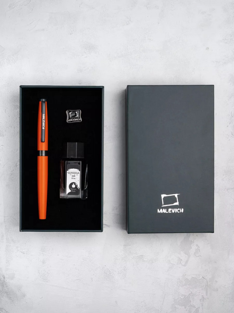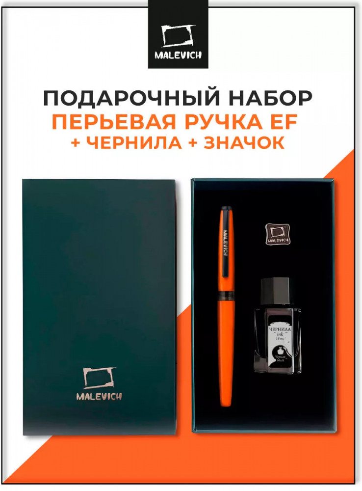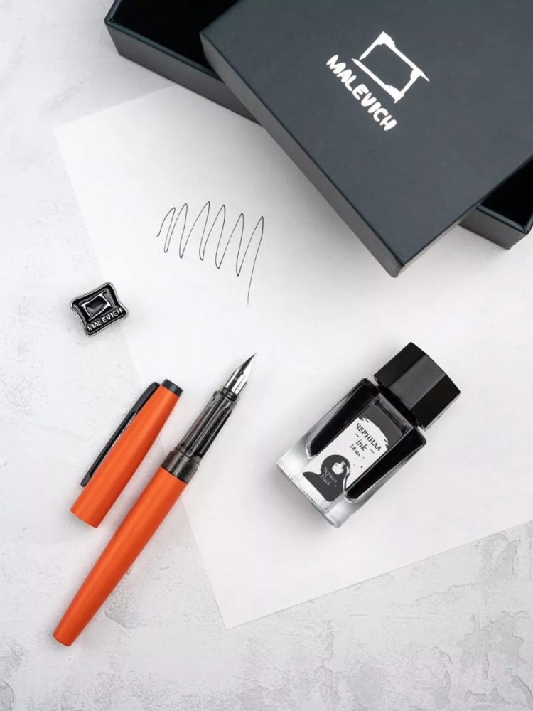 Ручка перьевая Малевичъ с конвертером в наборе с чернилами и фирменным уникальным значком в подарочной упаковке. Такой набор станет отличным подарком любителям каллиграфии или скетчинга. Ручка не заправлена, но в наборе уже есть все необходимое для творчества. Чернильная перьевая ручка с конвертером — идеальный выбор для ценителей классической канцелярии. Лаконичный дизайн ручки совмещает в себе вековые традиции, современные технологии и качество бренда. Ручка Малевич обладает тончайшим пером EF — толщина линии 0,4 мм. Чернила в наборе имеют насыщенный плотный черный цвет. Объем 18 мл, не перманентные.