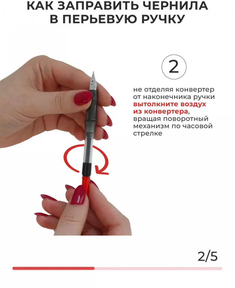 Чтобы заправить ручку необходимо: раскрутить корпус ручки, проверить плотность прилегания конвертера с перьевым блоком, спустить вниз поршень, покрутив верхнюю часть конвертера — таким образом избавиться от лишнего воздуха. Погрузить перо ручки в чернила (перо должно быть погружено в чернила наполовину своей длины). Поднимите поршень — чернила начнут заполнять капсулу конвертера. Если не получилось заправить ручку с первого раза, повторите все действия снова, возможно, нужно погрузить перо чуть глубже (но не утопив корпус). После заправки протрите аккуратно салфеткой излишки чернил. Закрутите корпус и ручка готова!