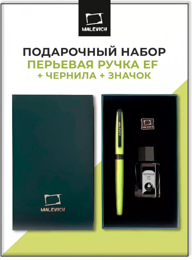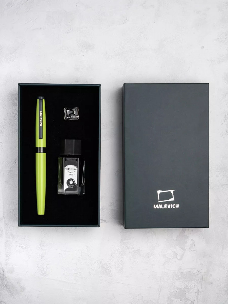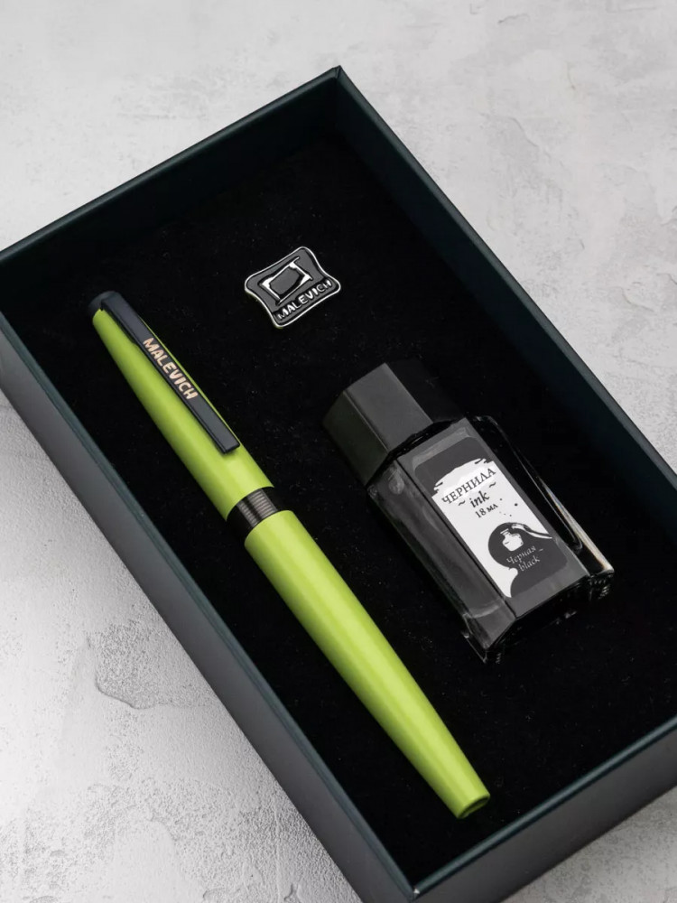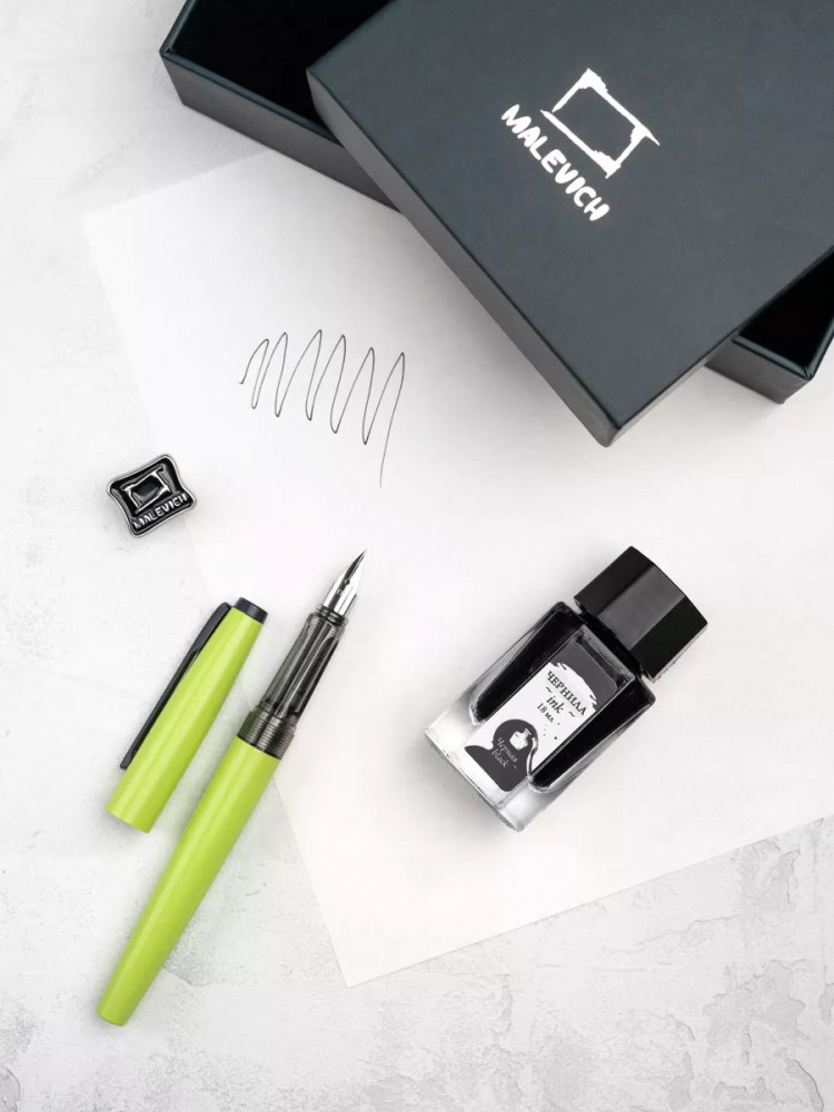 Ручка перьевая Малевичъ с конвертером в наборе с чернилами и фирменным уникальным значком в подарочной упаковке. Такой набор станет отличным подарком любителям каллиграфии или скетчинга. Ручка не заправлена, но в наборе уже есть все необходимое для творчества. Чернильная перьевая ручка с конвертером — идеальный выбор для ценителей классической канцелярии. Лаконичный дизайн ручки совмещает в себе вековые традиции, современные технологии и качество бренда. Ручка Малевич обладает тончайшим пером EF — толщина линии 0,4 мм. Чернила в наборе имеют насыщенный плотный черный цвет. Объем 18 мл, не перманентные.