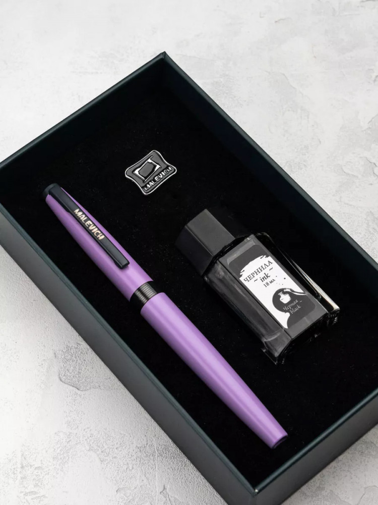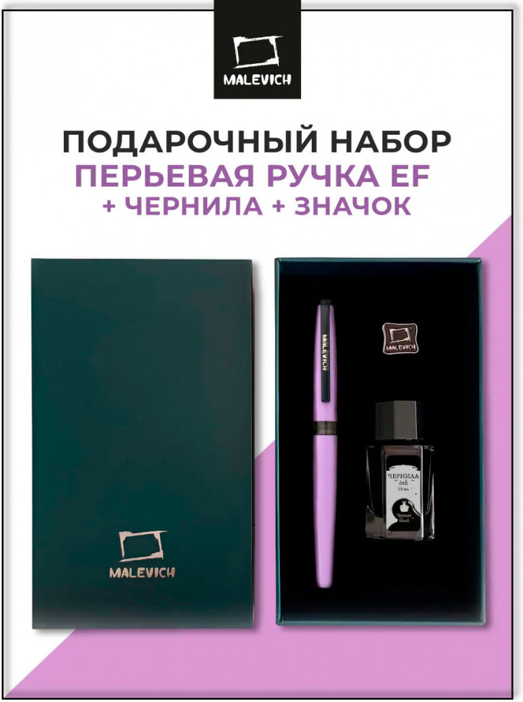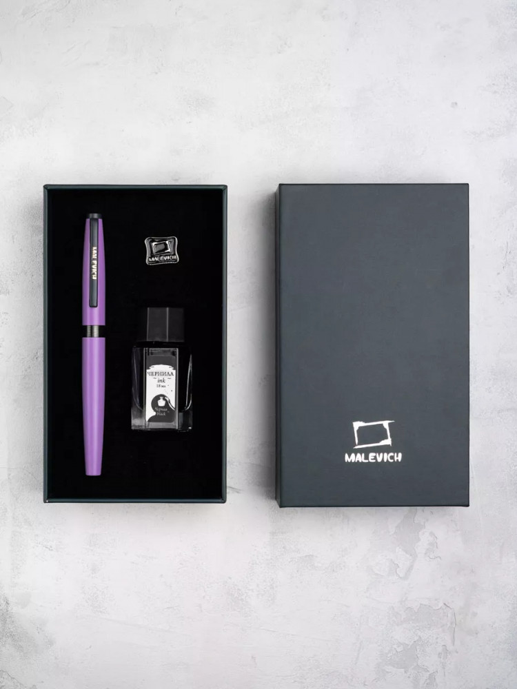 Ручка перьевая Малевичъ с конвертером в наборе с чернилами и фирменным уникальным значком в подарочной упаковке. Такой набор станет отличным подарком любителям каллиграфии или скетчинга. Ручка не заправлена, но в наборе уже есть все необходимое для творчества. Чернильная перьевая ручка с конвертером — идеальный выбор для ценителей классической канцелярии. Лаконичный дизайн ручки совмещает в себе вековые традиции, современные технологии и качество бренда. Ручка Малевич обладает тончайшим пером EF — толщина линии 0,4 мм. Чернила в наборе имеют насыщенный плотный черный цвет. Объем 18 мл, не перманентные.