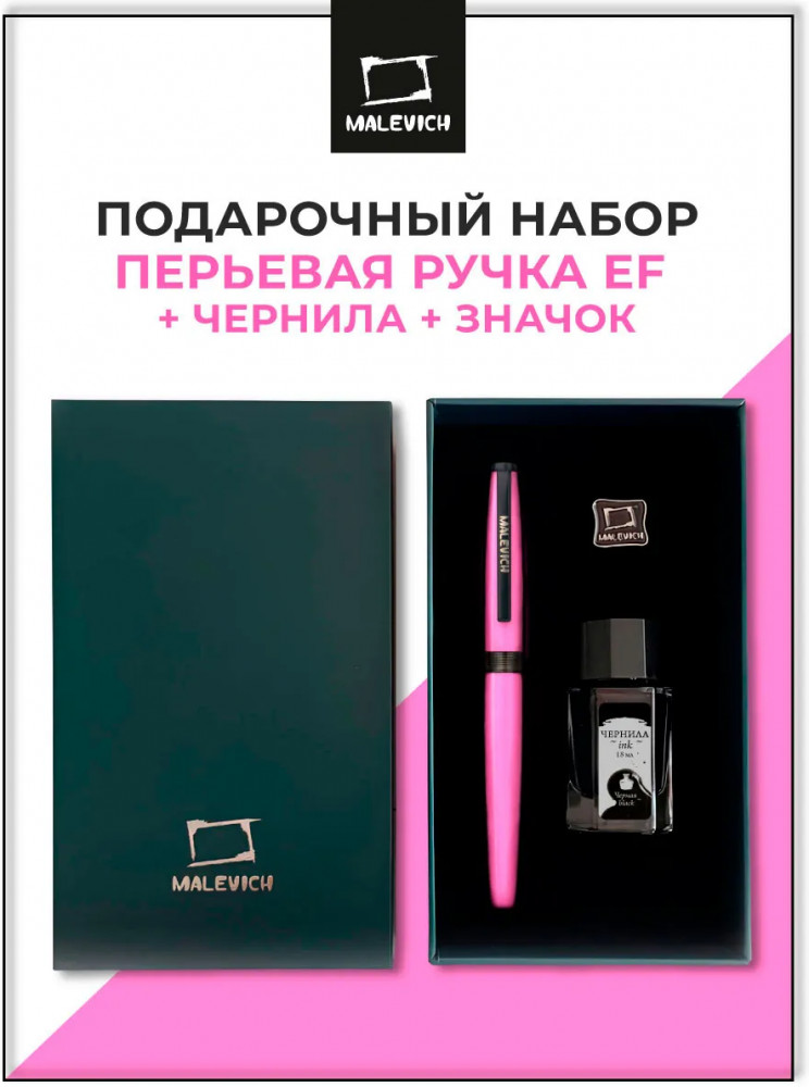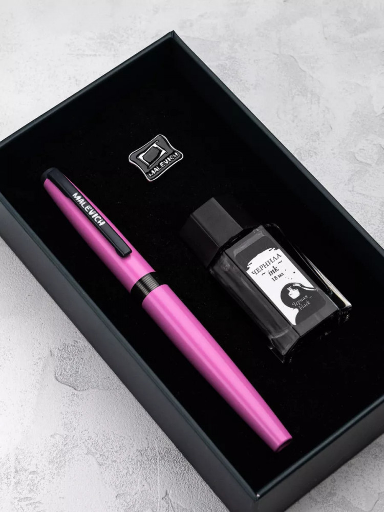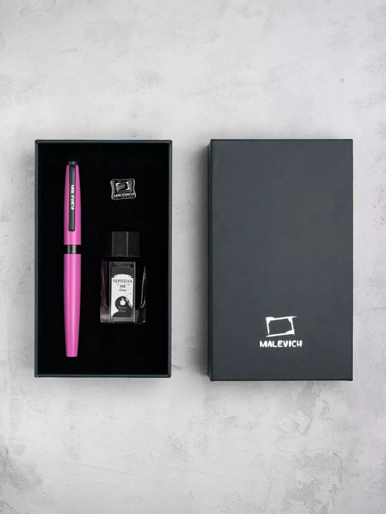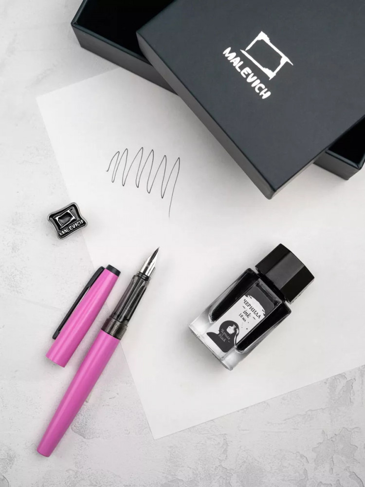 Ручка перьевая Малевичъ с конвертером в наборе с чернилами и фирменным уникальным значком в подарочной упаковке. Такой набор станет отличным подарком любителям каллиграфии или скетчинга. Ручка не заправлена, но в наборе уже есть все необходимое для творчества. Чернильная перьевая ручка с конвертером — идеальный выбор для ценителей классической канцелярии. Лаконичный дизайн ручки совмещает в себе вековые традиции, современные технологии и качество бренда. Ручка Малевич обладает тончайшим пером EF — толщина линии 0,4 мм. Чернила в наборе имеют насыщенный плотный черный цвет. Объем 18 мл, не перманентные.