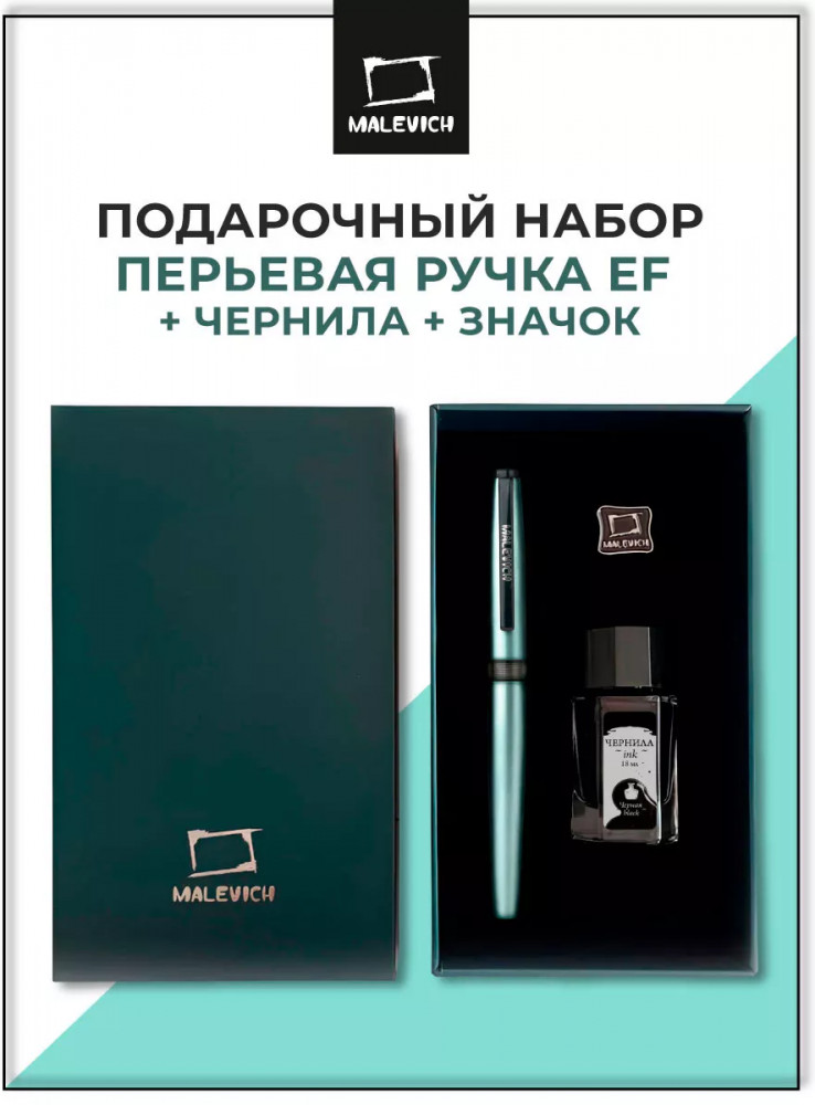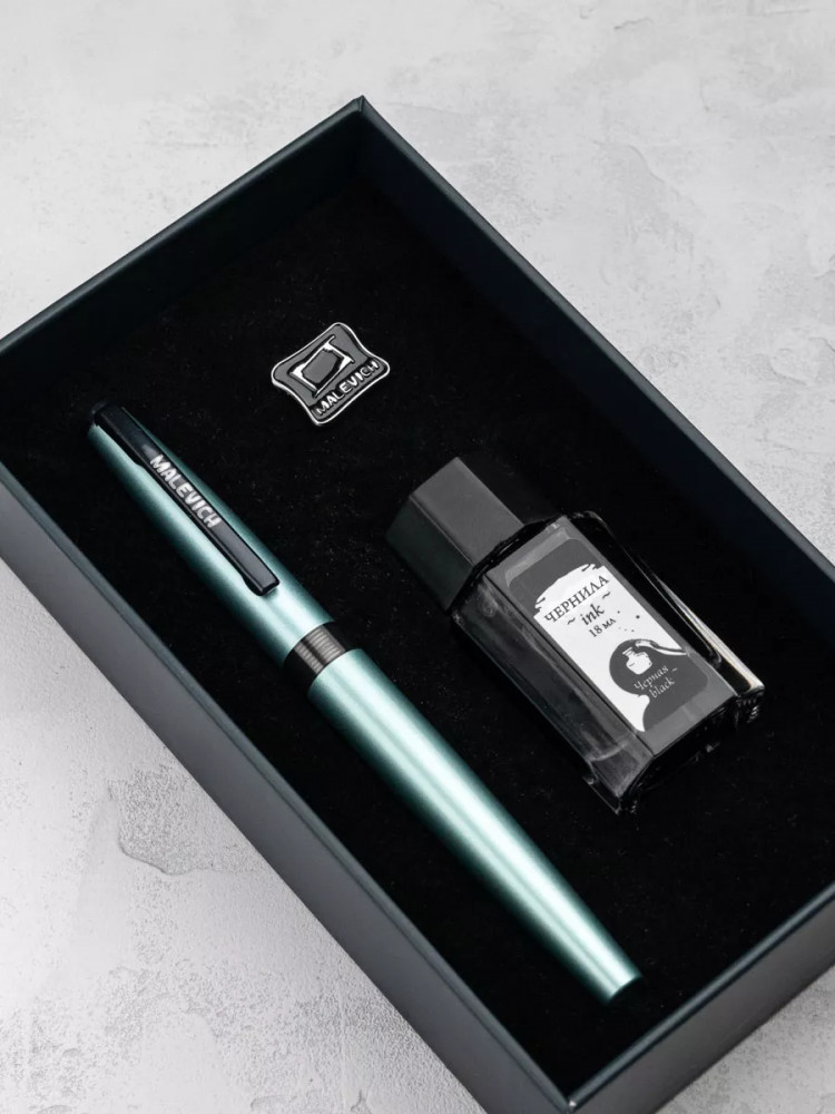 Ручка перьевая Малевичъ с конвертером в наборе с чернилами и фирменным уникальным значком в подарочной упаковке. Такой набор станет отличным подарком любителям каллиграфии или скетчинга. Ручка не заправлена, но в наборе уже есть все необходимое для творчества. Чернильная перьевая ручка с конвертером — идеальный выбор для ценителей классической канцелярии. Лаконичный дизайн ручки совмещает в себе вековые традиции, современные технологии и качество бренда. Ручка Малевич обладает тончайшим пером EF — толщина линии 0,4 мм. Чернила в наборе имеют насыщенный плотный черный цвет. Объем 18 мл, не перманентные.
