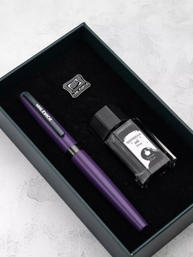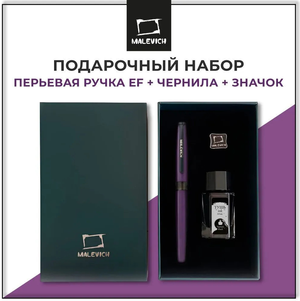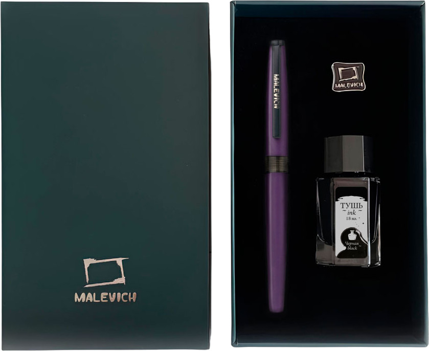Ручка перьевая Малевичъ с конвертером в наборе с чернилами и фирменным уникальным значком в подарочной упаковке. Такой набор станет отличным подарком любителям каллиграфии или скетчинга. Ручка не заправлена, но в наборе уже есть все необходимое для творчества. Чернильная перьевая ручка с конвертером — идеальный выбор для ценителей классической канцелярии. Лаконичный дизайн ручки совмещает в себе вековые традиции, современные технологии и качество бренда. Ручка Малевич обладает тончайшим пером EF — толщина линии 0,4 мм. Чернила в наборе имеют насыщенный плотный черный цвет. Объем 18 мл, не перманентные.