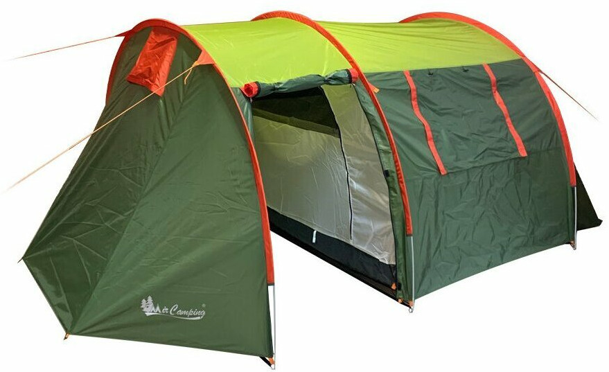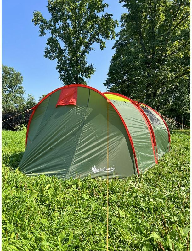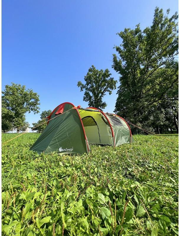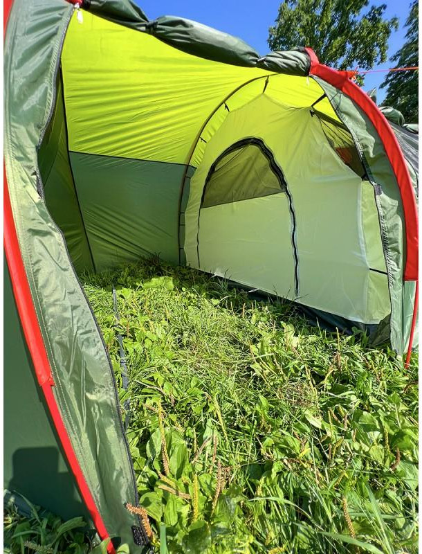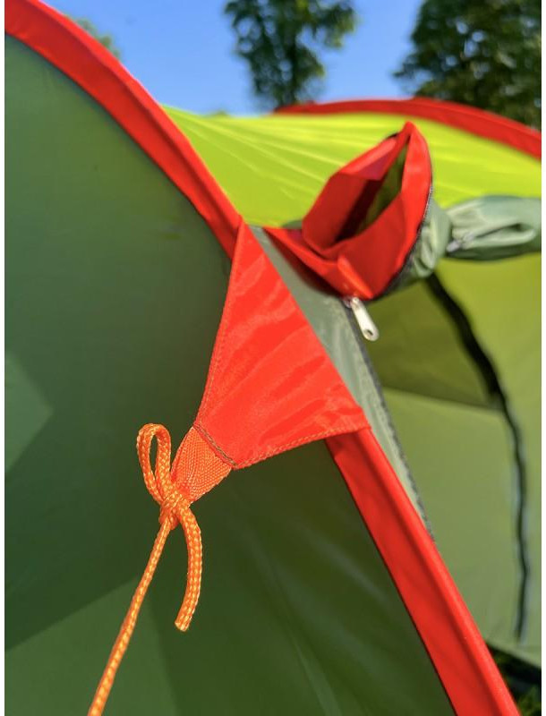 Кемпинговая палатка состоит из двух зон — это спальная зона и зона тамбура. Она имеет форму полубочки. Такой формат очень удобен для долгого проживания на природе. Каркас палатки создан из трех фибергласовых дуг особой прочности. Они надежны и легки в сборке. Данная модель отлично выстоит в непогоду, так как внешнее покрытие сделано из полиэстера с полиуретановой пропиткой (3000 мм вс). Он славится своей водонепроницаемостью и возможностью выдержать даже затяжной ливень. Дно палатки — армированный полиэтилен. Внутренний слой сделан из легкой и воздухопроницаемой ткани, которая легко будет поддерживать оптимальную температуру в палатке.