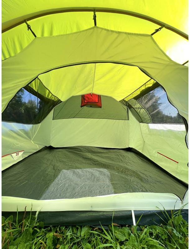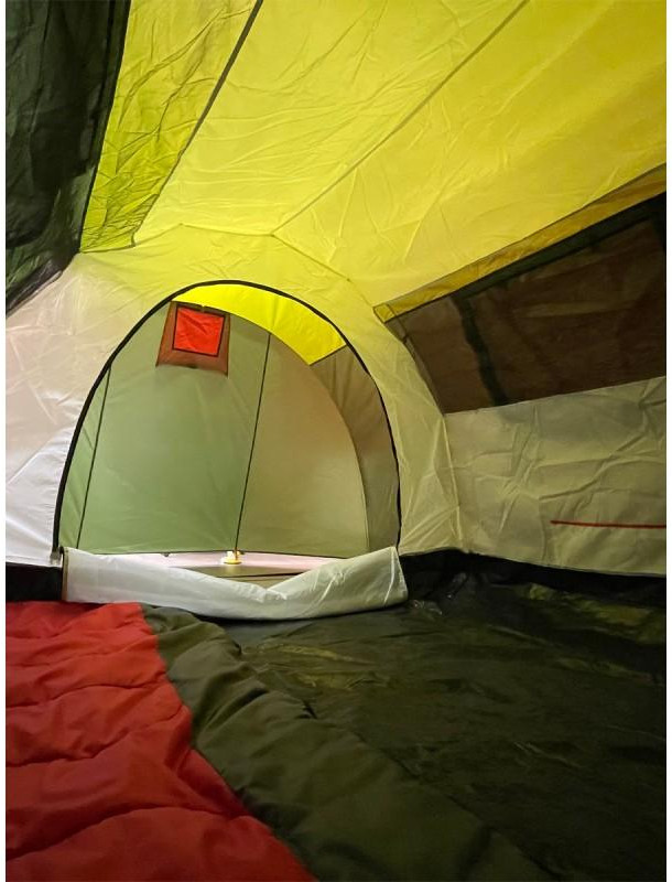 Палатка рассчитана на проживание в ней трех человек, при желании в тамбур может поместиться четвертый. В ней очень удобно перемещаться, так как в высоту она 150 см. В спальной зоне находится три окна с москитными сеточками, которые не пропускают насекомых. Еще есть два кармана для мелких вещей в легкой доступности и крюк для освещения. В зоне тамбура много места, чтобы разместить там все свои вещи или, например, оборудовать кухню.
