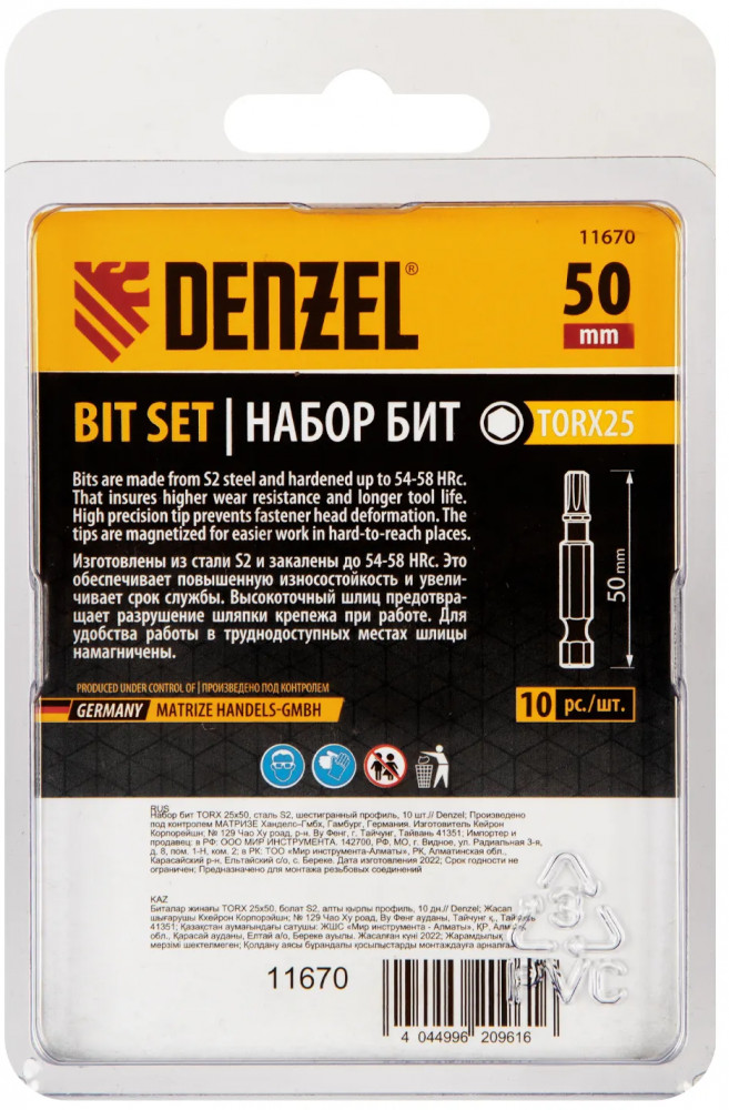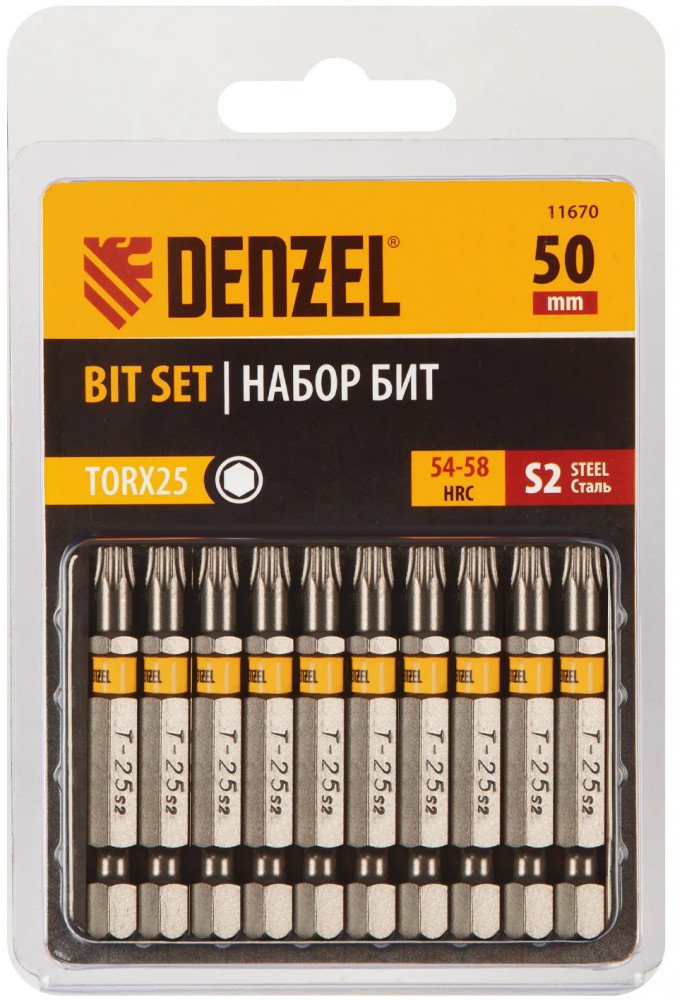 Набор бит TORX 25 × 50 мм Denzel 11670 включает в себя 10 насадок с хвостовиком 1/4", из стали S2, для работы с шуруповертами. Шлиц в форме звезды служит для быстрого монтажа и демонтажа винтов при сборке бытовой техники и электроприборов. Набор универсален и подходит как для бытового, так и для профессионального применения. Благодаря конструктивной особенности лучи «звезды» надежно сцепляются с крепежом, нагрузка равномерно распределяется на все грани, это снижает риск соскальзывания биты и обеспечивает высокую точность работ.