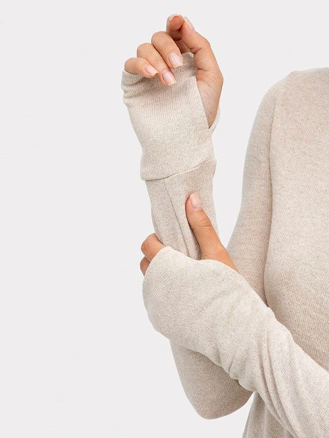 приятный к телу,прохладное время года самое то, за счёт рукав с прорезью