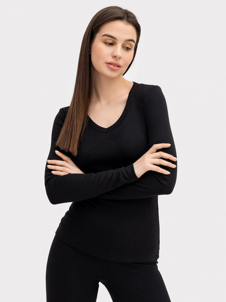 Женский комплект «термо», включающий джемпер и легинсы. Джемпер прилегающий, с длинным рукавами и классическим V-образным вырезом. Легинсы плотно облегают ноги, отличаются плоскими швами, высокой линией талии и эластичной резиной в поясе. Женское термобельё — это прекрасный способ обеспечить себе комфорт в холодное время года. Особая технология производства тканей позволяет отводить и испарять влагу, выделяемую телом в ходе активного движения или занятий спортом, а также сохранять собственное тепло. В связи с этим в термобелье вы не замерзнете даже при очень низкой температуре воздуха и будете надежно защищены от зябкой дрожи и пронизывающей сырости. Эта одежда идеально подходит для любителей активного отдыха в суровую зимнюю пору. Мягкое и тонкое, но при этом теплое термобельё не будет выделяться даже под облегающей верхней одеждой.