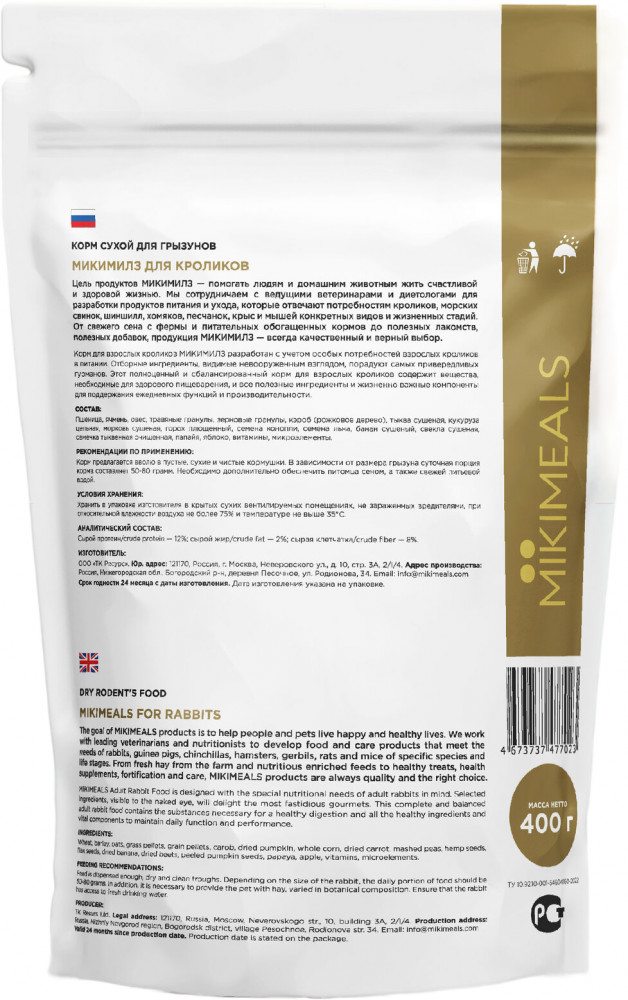Состав корма обогащен сушеными овощами, плющеными бобами и плодами редких растений. Корм для кроликов содержит витаминно—минеральный комплекс.