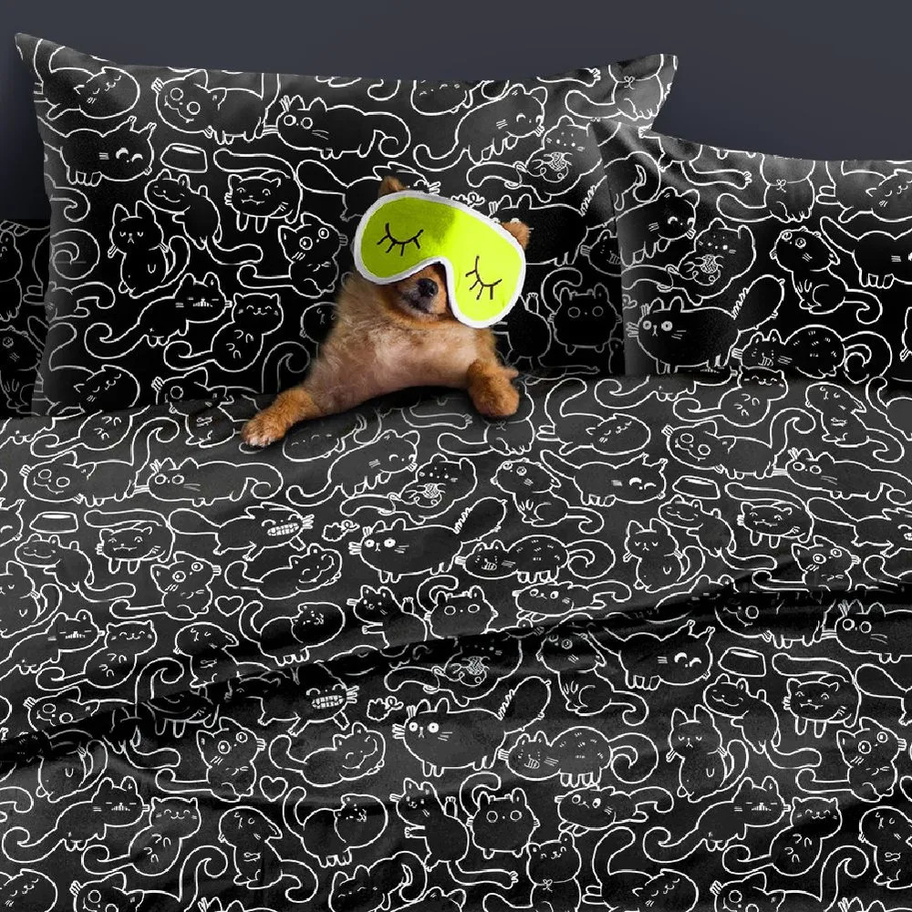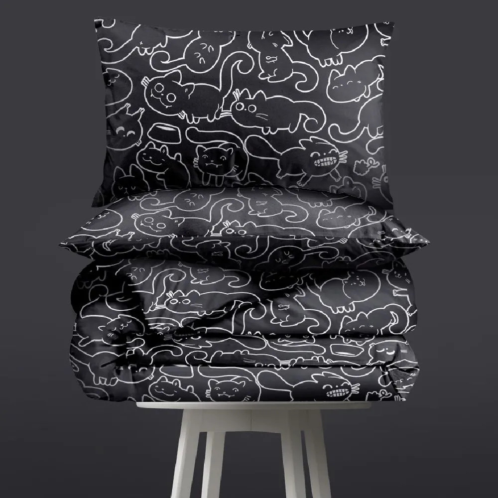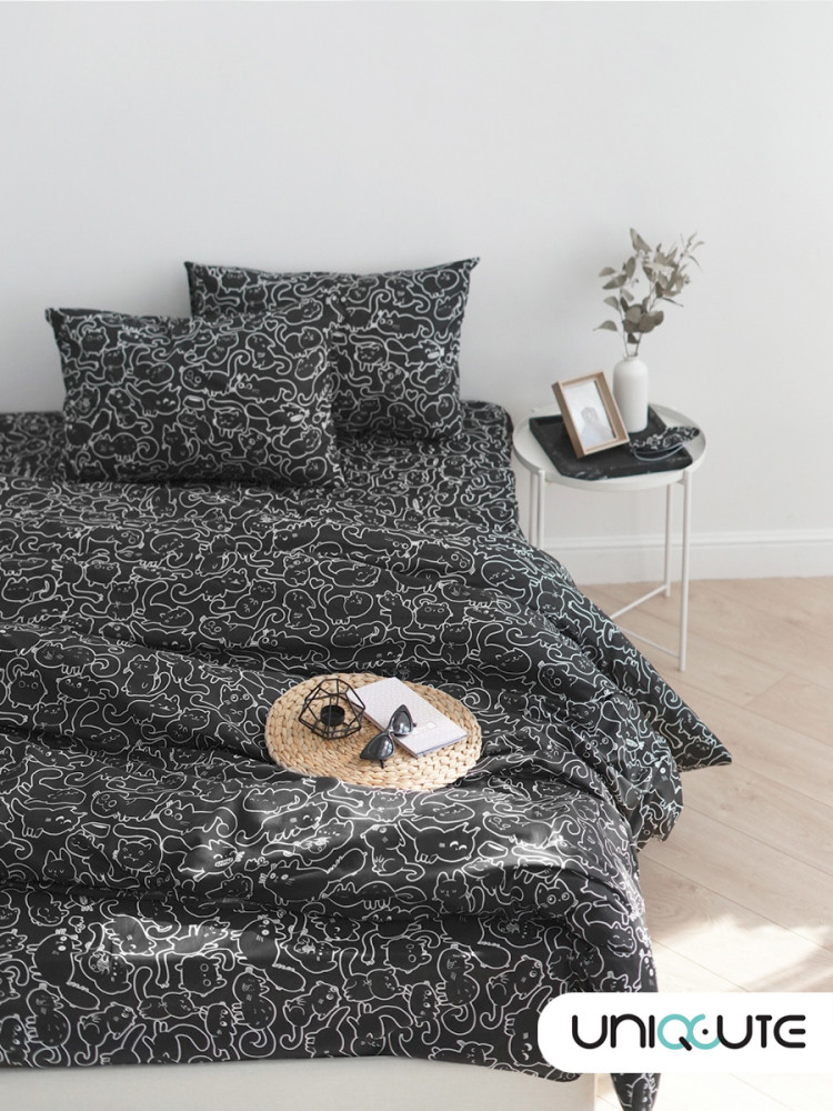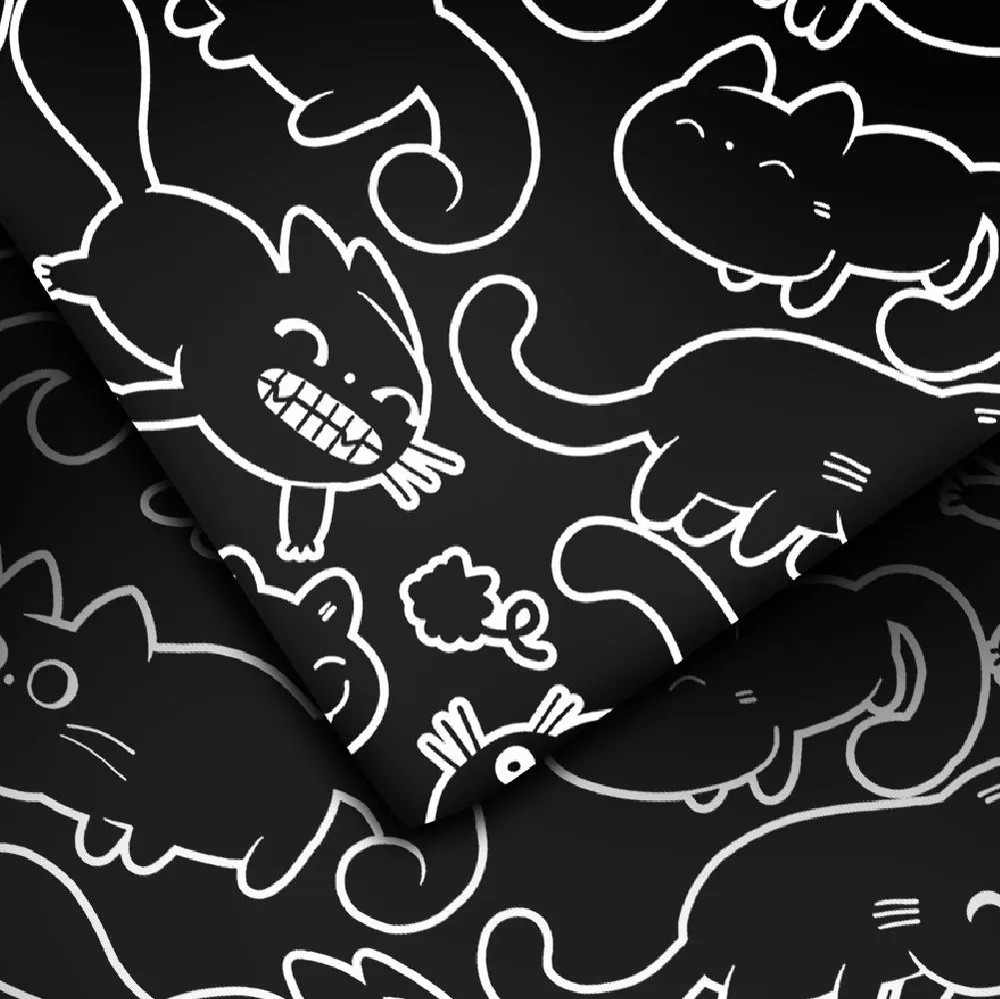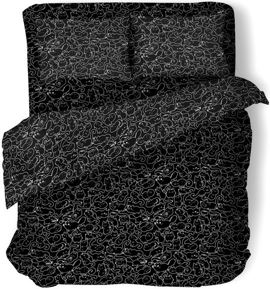 Взрослая жизнь — совсем не повод окружать себя скучными однотонными вещами. Разбудите своего внутреннего ребенка с ярким, милым и необычным постельным бельем Unicqute.Минимализм и милота отлично уживаются вместе, когда речь идет о комплекте Майи 2. Рисунки с котиками на стильном черном фоне настолько разнообразны и оригинальны, что много вечеров подряд будут заменять вам традиционное чтение перед сном.