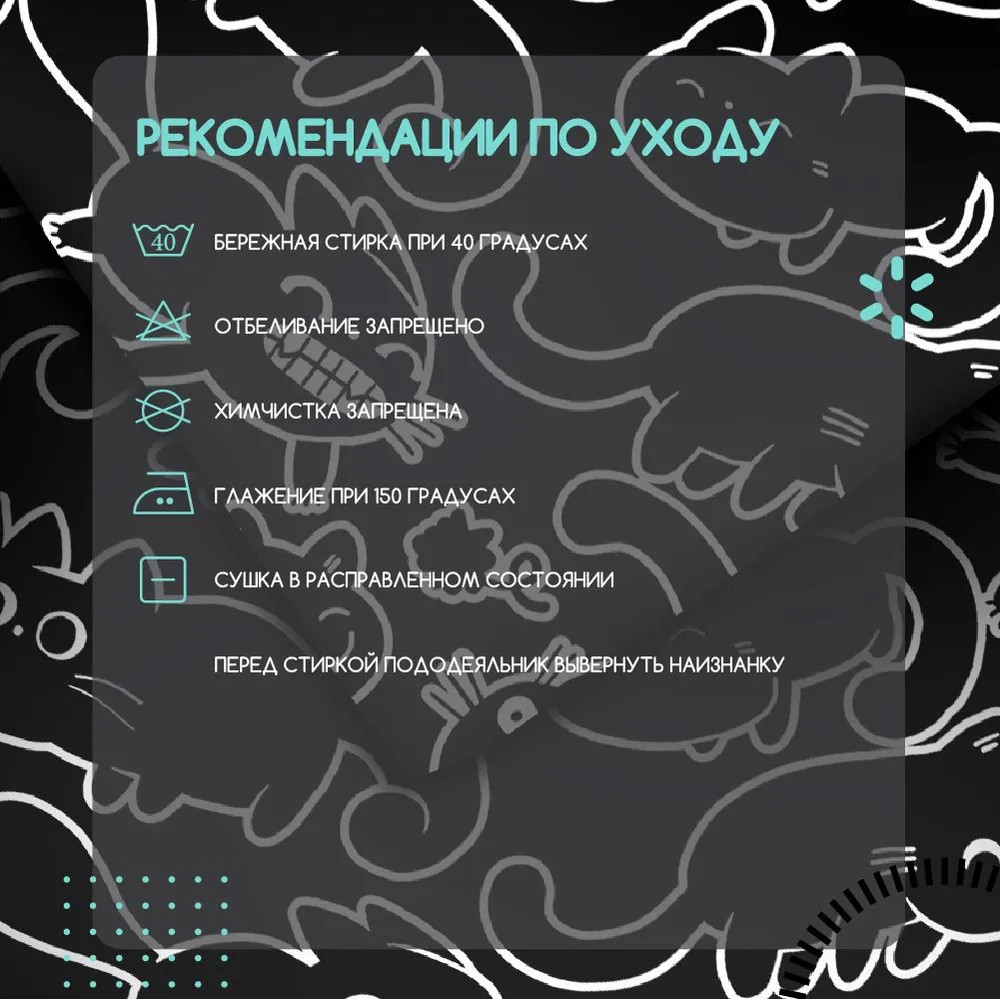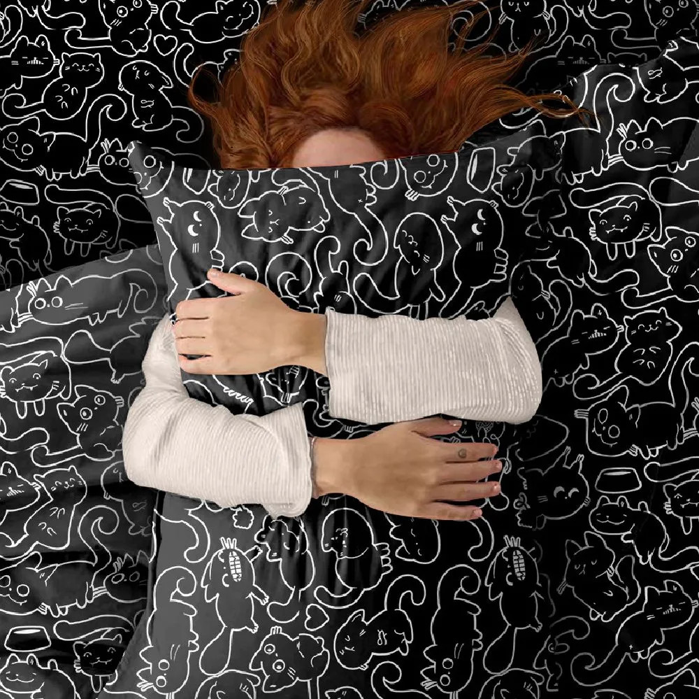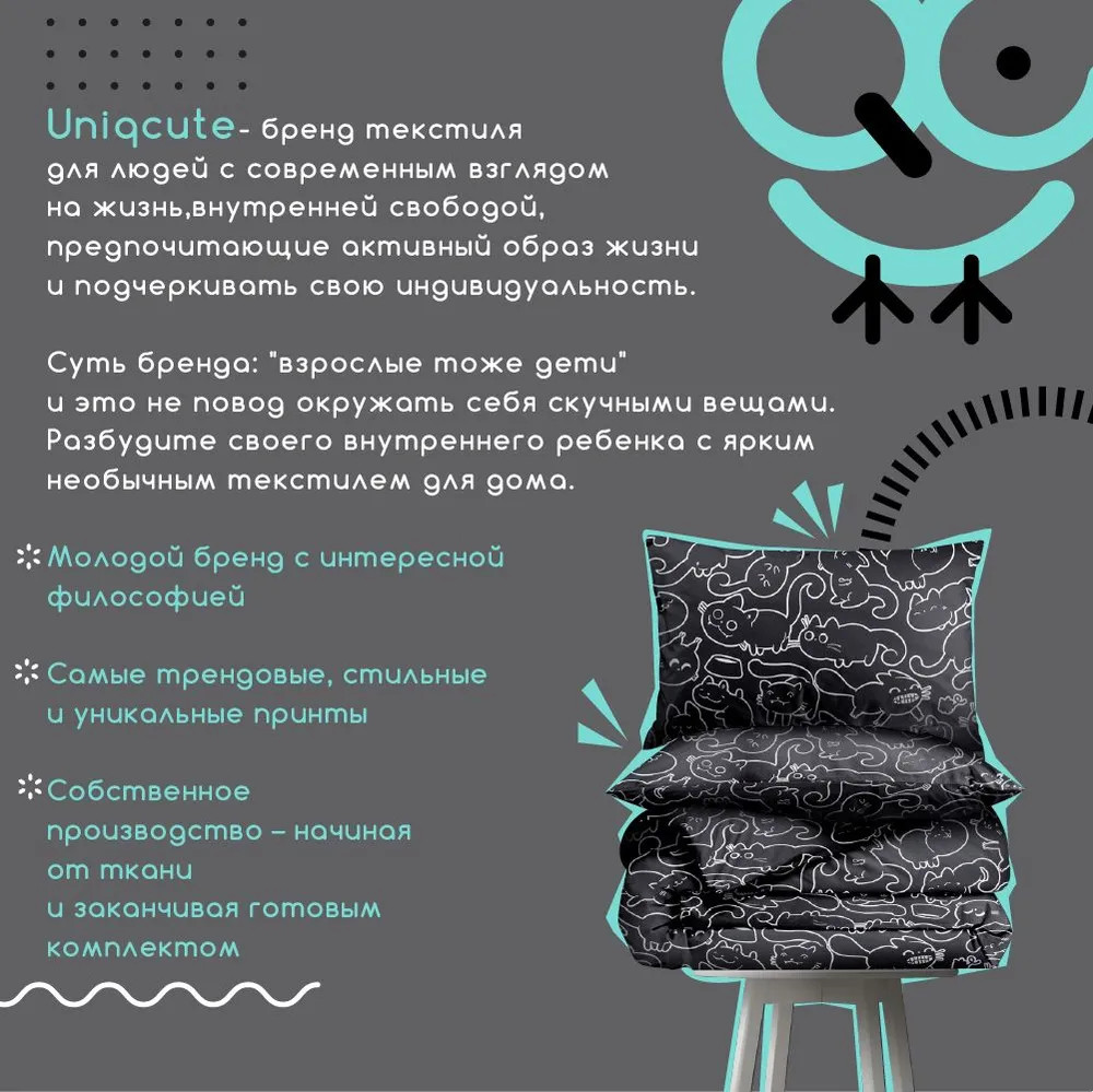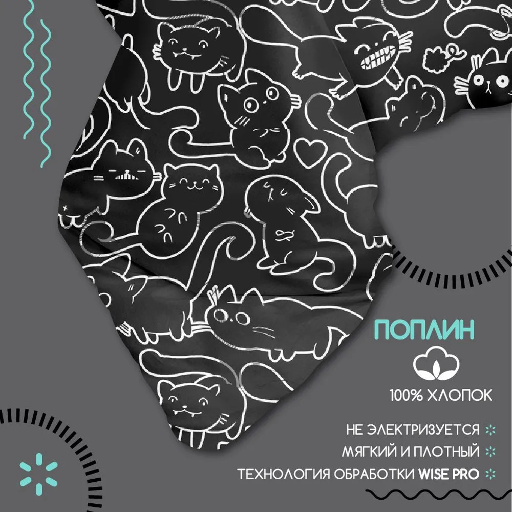 Взрослая жизнь — совсем не повод окружать себя скучными однотонными вещами. Разбудите своего внутреннего ребенка с ярким, милым и необычным постельным бельем Unicqute.Минимализм и милота отлично уживаются вместе, когда речь идет о комплекте Майи 2. Рисунки с котиками на стильном черном фоне настолько разнообразны и оригинальны, что много вечеров подряд будут заменять вам традиционное чтение перед сном.
