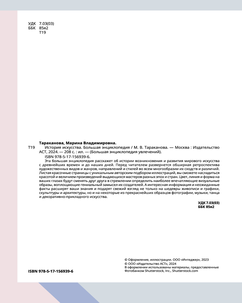 Серия: Большая энциклопедия увлечений История искусства — это череда сменяющих друг друга художественных стилей и форм, техник и приемов. Разные течения оставляют после себя выдающиеся произведения живописи и скульптуры, потрясающие архитектурные сооружения и неподражаемые образцы декоративно-прикладного искусства. Каждое творческое направление отражает не только эстетические идеалы, но и мировоззрение людей соответствующего времени. Через пеструю мозаику самых разных образов мы можем заглянуть в прошлое, лучше понять своих предков и попытаться найти истоки всего, что создается вокруг нас сегодня.
