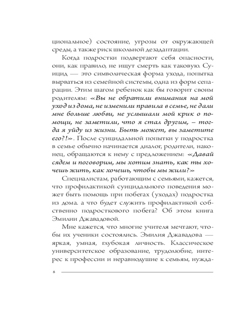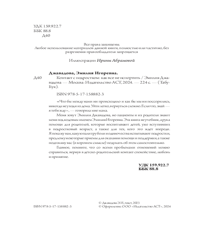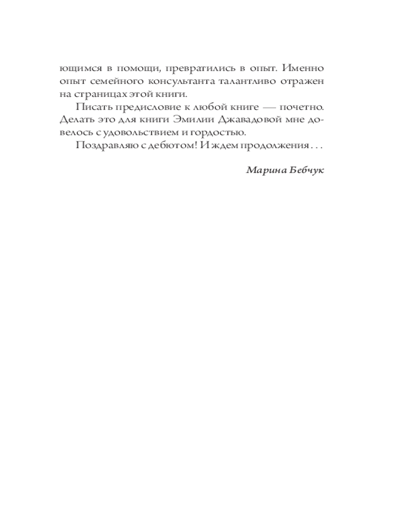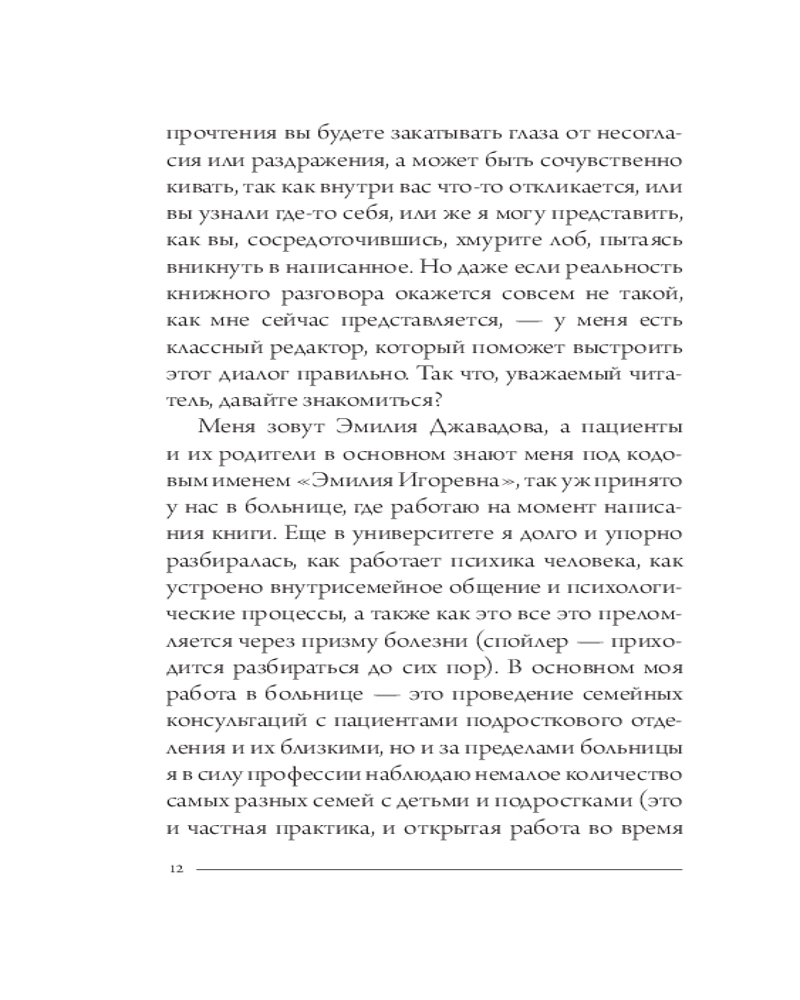 Меня зовут Эмилия Джавадова, но пациенты и их родители знают меня под кодовым именем Эмилия Игоревна. Эта книга не учебник, а рука помощи для родителей, которые воспитывают детей, уже вступивших в подростковый возраст, а также для тех, кого это ждет впереди. Я покажу вам, какую палитру боли и одиночества испытывают подростки, предложу некоторые приемы для оказания помощи и поддержки, а также подтолкну вас (в хорошем смысле) подумать об этом самостоятельно. Главное, помните, что со всеми проблемами отношений можно справиться, вернув в детско-родительский контакт спокойствие, любовь и принятие. |