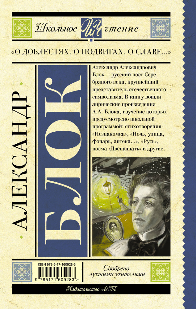 В данный момент этот товар отсутствует в продаже. Возможно, у нас найдется аналогичный или похожий товар здесь. Серия: Школьное чтение Александр Александрович Блок — русский поэт Серебряного века, крупнейший представитель отечественного символизма. В книгу вошли лирические произведения А.А. Блока, изучение которых предусмотрено школьной программой: стихотворения: «Незнакомка», «Ночь, улица, фонарь, аптека...», «Русь», поэма «Двенадцать» и другие. |