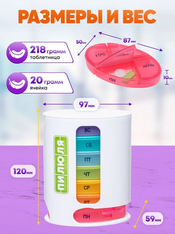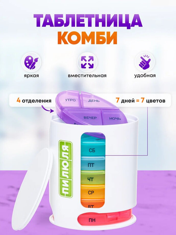 💳 Оплатить за товар можно при получении 🇰🇿 Есть бесплатная доставка по Казахстану от 1 дня 🎁 Копите бонусы с каждой покупки Таблетницы предназначены для компактного и упорядоченного хранения лекарственных средств или витаминов. Универсальная таблетница «Комби» разработана специально для активных людей, которым необходимо принимать лекарства несколько раз в течение недели или дольше, как дома, так и в дороге. |