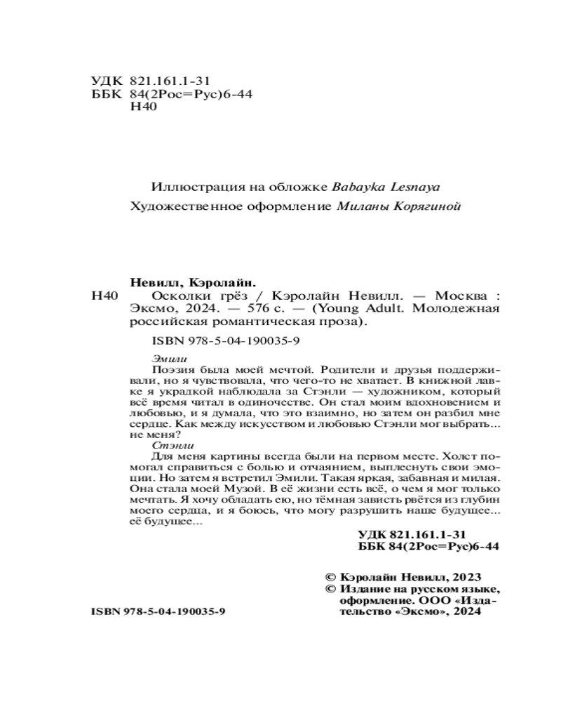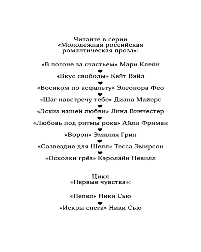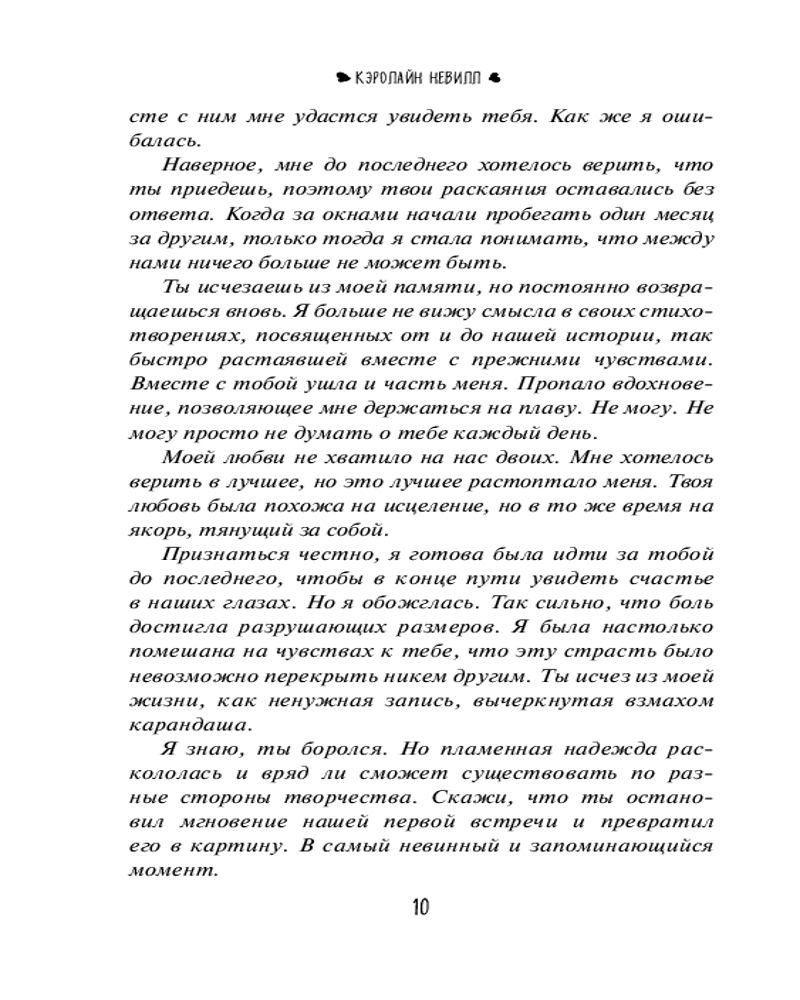 В данный момент этот товар отсутствует в продаже. Возможно, у нас найдется аналогичный или похожий товар здесь. Серия: Young Adult. Молодежная российская романтическая проза Дебют Кэролайн Невилл! Более 23 тысяч прочтений на Wattpad! История любви двоих творческих людей, наполненная драмой, нежностью, предательством и болью. Для всех, кто любит переживать за судьбу героев! В книге вас ждет: первая любовь, художник и поэтесса, проблемы в семье, второй шанс, любовный треугольник.