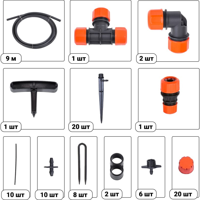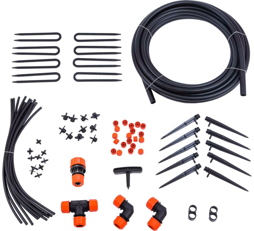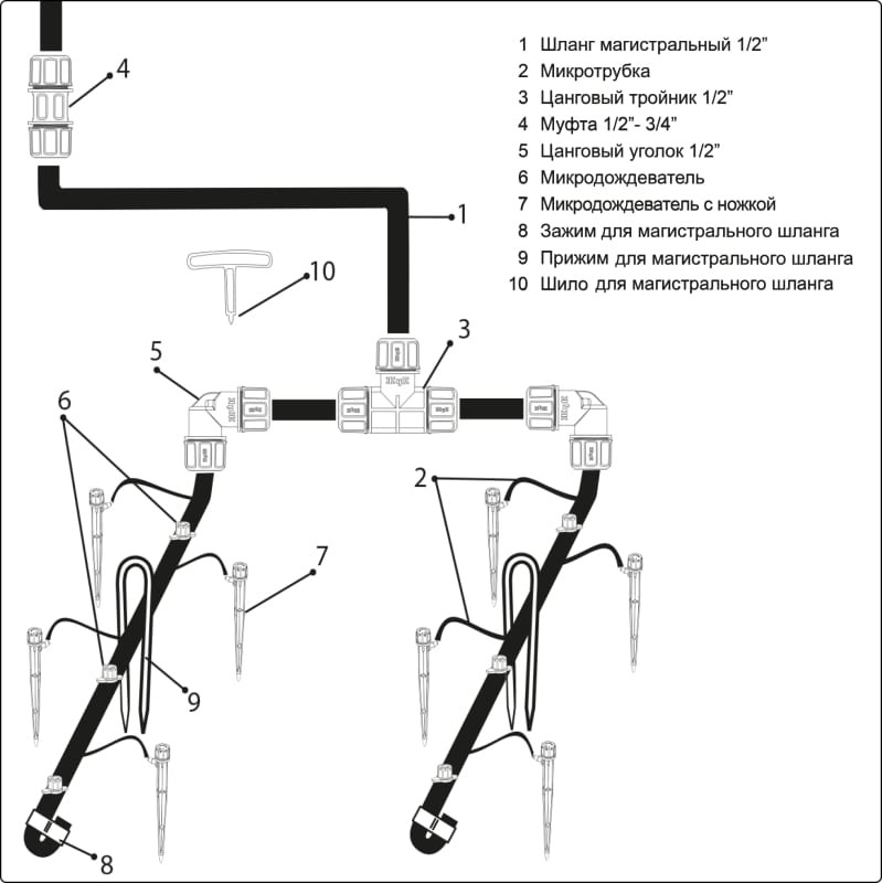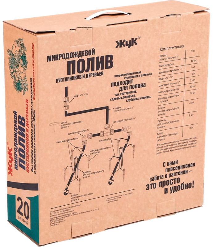 Комплект микродождевого полива предназначен для направленного полива кустарников и деревьев. Предусмотрена возможность регулировки диаметра. Зоны полива в диапазоне 10-30 см. Микродождеватель устанавливается на магистральный шланг, а микродождеватель с ножкой устанавливается в стороне от магистрального шланга и подключается к нему через микротрубку. Съёмный регулируемый наконечник дождевателя легко прочистить в случае его засорения. Комплект на 20 растений рассчитан для организации полива на площади от 2 до 4 кв.м.