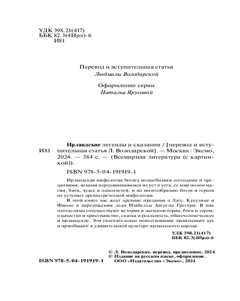 💳 Оплатить за товар можно при получении 🇰🇿 Есть бесплатная доставка по Казахстану от 1 дня 🎁 Копите бонусы с каждой покупки Серия: Всемирная литература (новое оформление) Мир ирландской мифологии полон магии, битв, чудес и опасностей. В этой книге вас ждут древние предания о Луге, Кухулине и Финне в переложении леди Изабеллы Августы Грегори. В них неотделимо сосуществуют история и псевдоистория, боги и герои, язычество и христианство, сказка и реальность, общечеловеческое и ирландское. Эти увлекательные повествования захватывают дух и приобщают к удивительной культуре ирландского народа. |