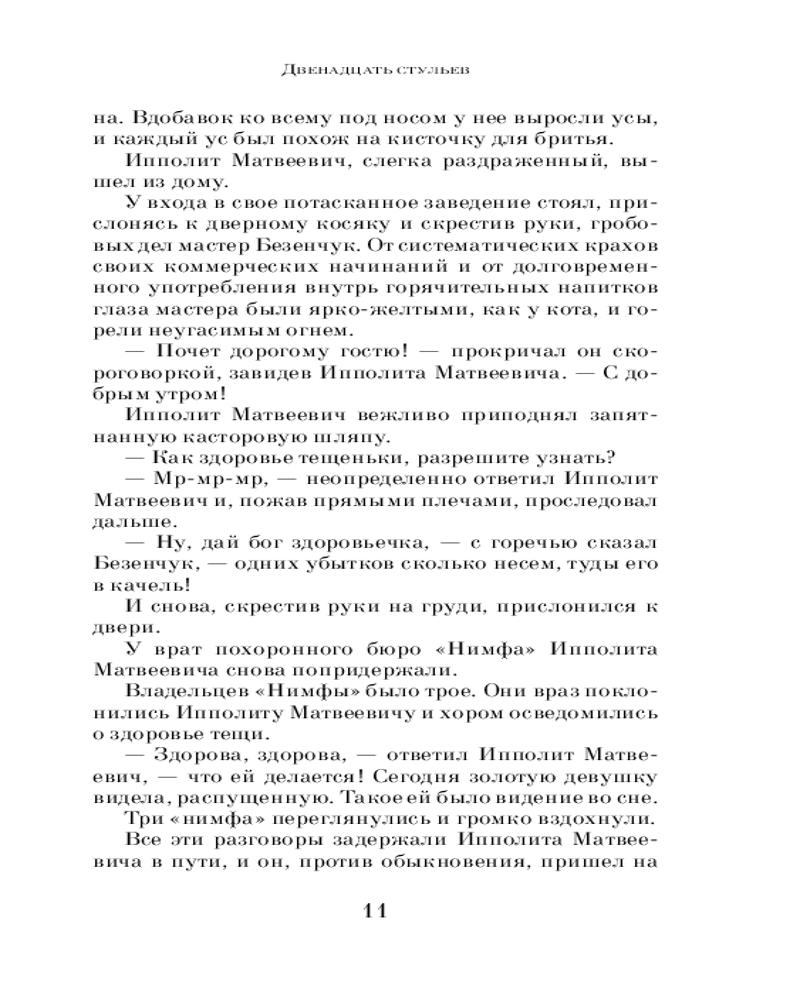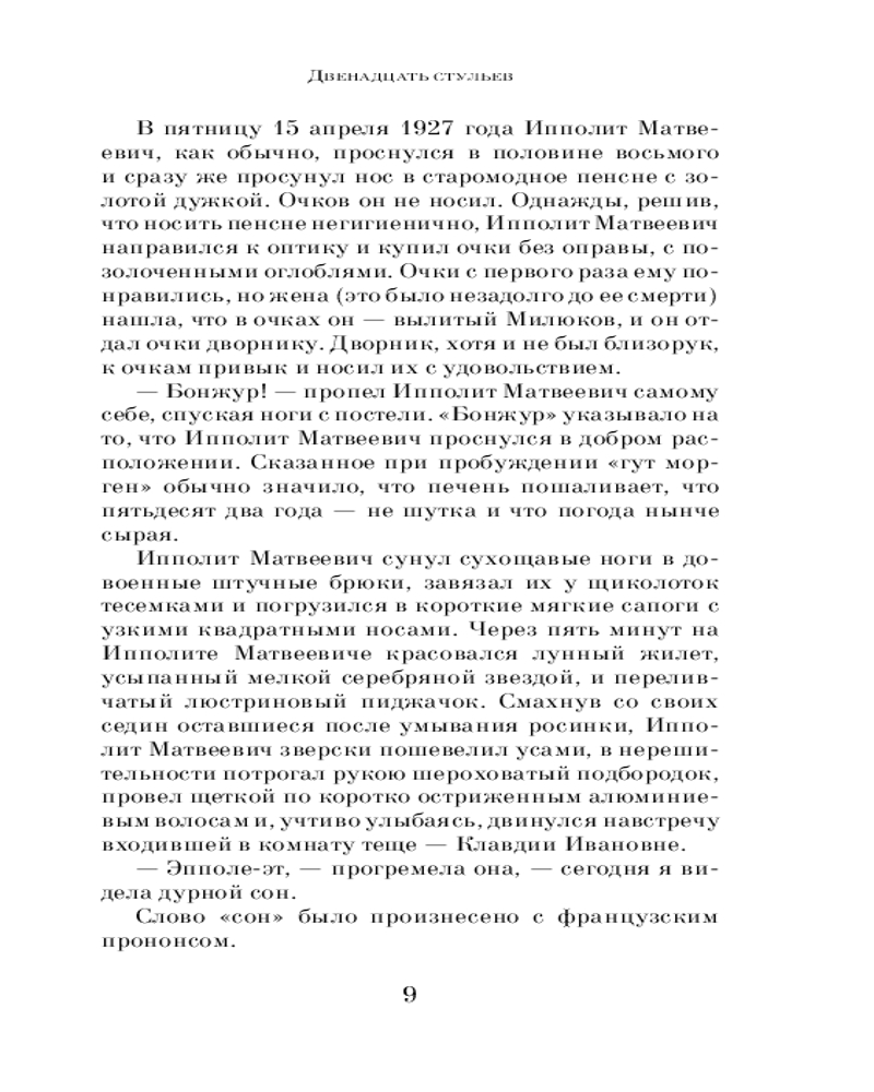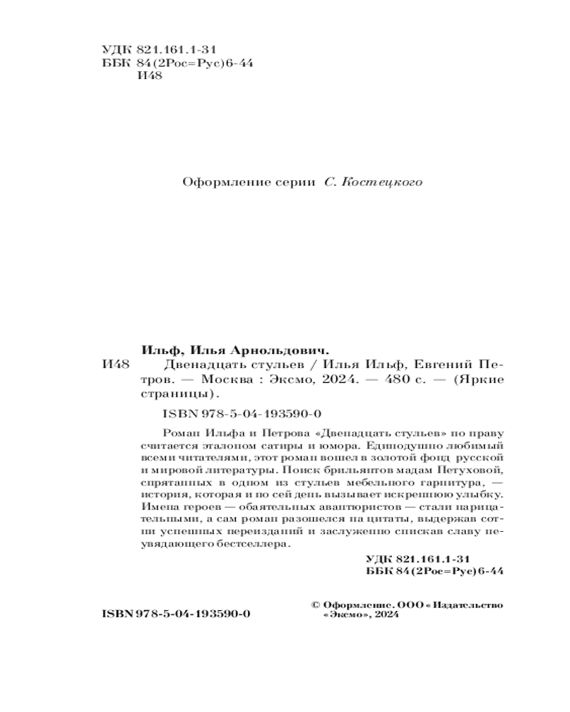 В данный момент этот товар отсутствует в продаже. Возможно, у нас найдется аналогичный или похожий товар здесь. Серия: Яркие страницы Роман Ильфа и Петрова «Двенадцать стульев» по праву считается эталоном сатиры и юмора. Единодушно любимый всеми читателями, этот роман вошел в «золотой фонд» русской и мировой литературы. Поиск брильянтов мадам Петуховой, спрятанных в одном из стульев мебельного гарнитура, — история, которая и по сей день вызывает искреннюю улыбку . Имена героев — обаятельных авантюристов — стали нарицательными, а сам роман разошелся на цитаты, выдержав сотни успешных переизданий и заслуженно снискав славу неувядающего бестселлера. |
