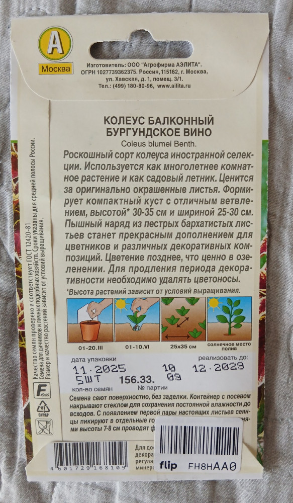 Аэлита Колеус балконный «Бургундское вино»+14 высокая всхожесть красивая расцветка свежие семена