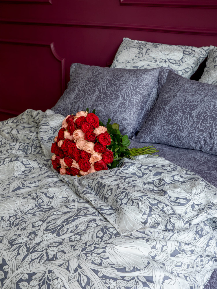 Комплект выполнен из ткани сатин. Это ткань сатинового переплетения из 100% хлопка. Поверхность нежная и шелковистая, а сам материал отличается повышенной мягкостью, устойчивостью к сминанию и долговечностью.