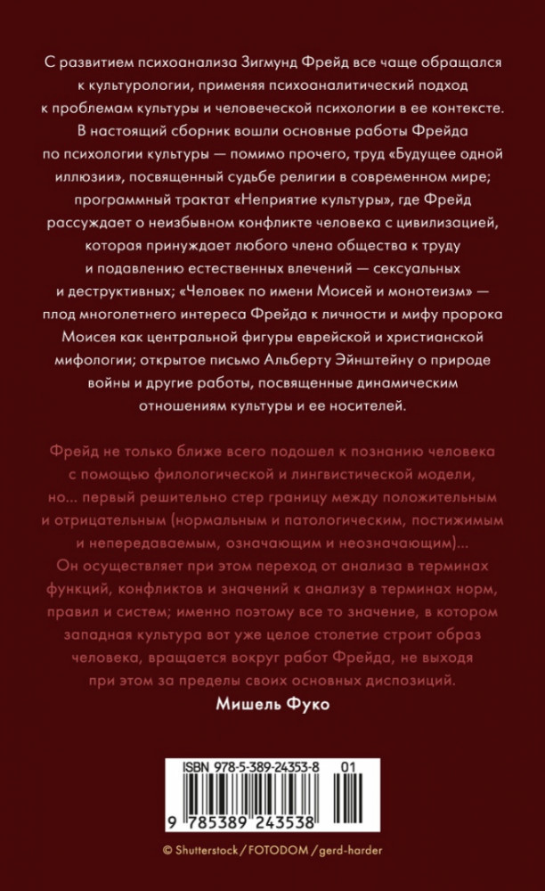 💳 Оплатить за товар можно при получении 🇰🇿 Есть бесплатная доставка по Казахстану от 1 дня 🎁 Копите бонусы с каждой покупки Серия: Человек Мыслящий. Идеи, способные изменить мир С развитием психоанализа Зигмунд Фрейд все чаще обращался к культурологии, применяя психоаналитический подход к проблемам культуры и человеческой психологии в ее контексте. В настоящий сборник вошли основные работы Фрейда по психологии культуры — помимо прочего, труд «Будущее одной иллюзии», посвященный судьбе религии в современном мире; программный трактат «Неприятие культуры», где Фрейд рассуждает о неизбывном конфликте человека с цивилизацией, которая принуждает любого члена общества к труду и подавлению естественных влечений — сексуальных и деструктивных; «Человек по имени Моисей и монотеизм» — плод многолетнего интереса Фрейда к личности и мифу пророка Моисея как центральной фигуры еврейской и христианской мифологии; открытое письмо Альберту Эйнштейну о природе войны; и другие работы, посвященные динамическим отношениям культуры и ее носителей. Некоторые работы в этом сборнике публикуются в новом переводе. |