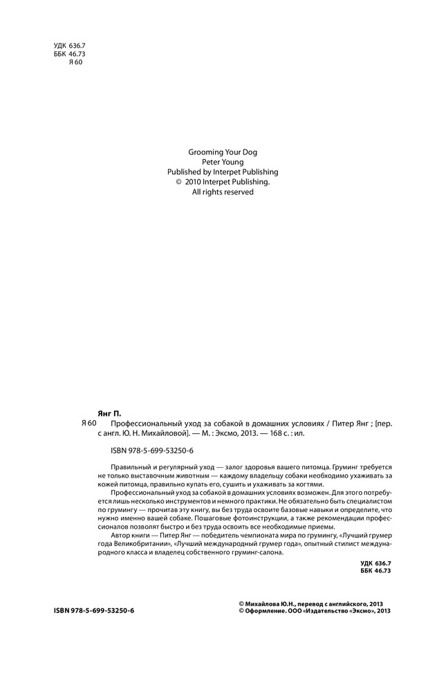 Автор книги — Питер Янг — победитель чемпионата мира по грумингу, «Лучший грумер года Великобритании», «Лучший международный грумер года», опытный стилист международного класса и владелец собственного груминг-салона. |