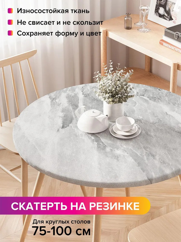 Скатерть очень понравилась. Нам мой сто диаметром 90 см подошла идеально. цвет неяркий, в глаза не бросается. Материал - полиэтер, если что-то прольётся, то не впитается. Можно быстро вытереть. Сшита хорошо