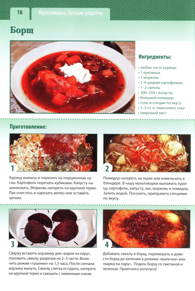 Книга красочно оформлена, рецепты все очень простые, знакомые, но данный сборник помогает все это приготовить в мультиварке, что экономит время и намного полезней, ведь в ней можно некоторое готовить без жиров и масел. Единственно - нет рецептов приготовления блюд из рыбы. Взяла на подарок. Спасибо команде Флип за организованную работу, подбор ассортимента товаров (об этом я не устаю говорить), удобства, которые Вы создаете для покупателей, очень нравится пользоваться Вашим сайтом, хочется снова и снова что-либо приобрести.