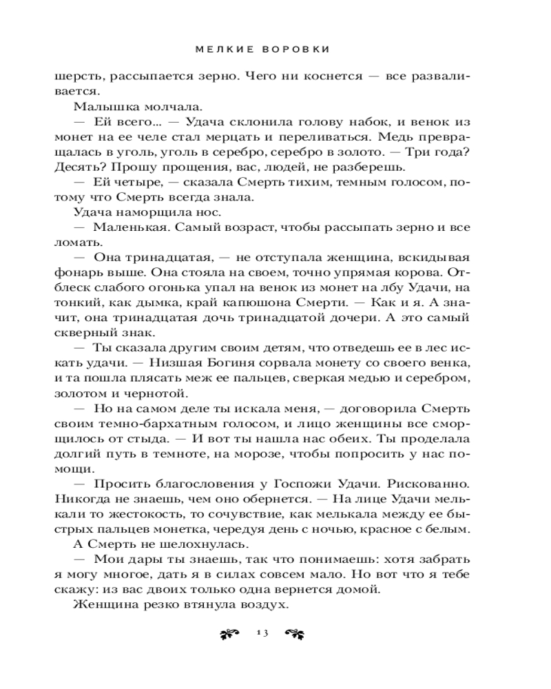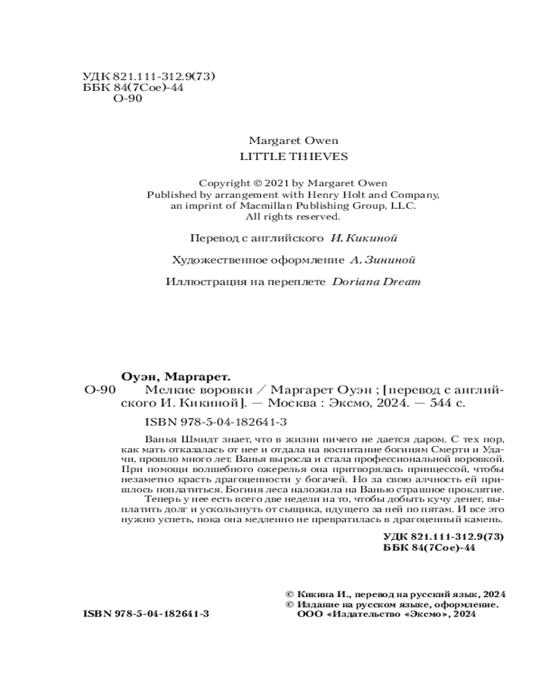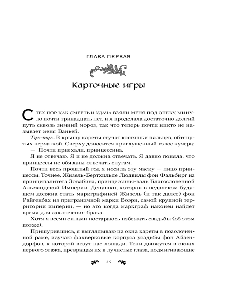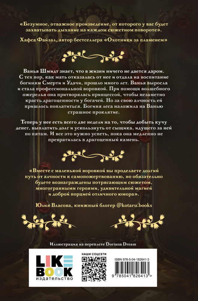 В данный момент этот товар отсутствует в продаже. Возможно, у нас найдется аналогичный или похожий товар здесь. Серия: Youg Adult. Любовная магия. Бестселлеры ромэнтези Ваня Шмидт знает, что в жизни ничего не дается даром. С тех пор, как мать отказалась от нее и отдала на воспитание богиням Смерти и Удачи, прошло много лет. Ваня выросла и стала профессиональной воровкой. При помощи волшебного ожерелья она притворялась принцессой, чтобы незаметно красть драгоценности у богачей. Но за свою алчность ей пришлось поплатиться. Богиня леса наложила на Ваню страшное проклятие. Теперь у нее есть всего две недели на то, чтобы добыть кучу денег, выплатить долг и ускользнуть от сыщика, идущего за ней по пятам. И все это нужно успеть, пока она медленно не превратилась в драгоценный камень. |
