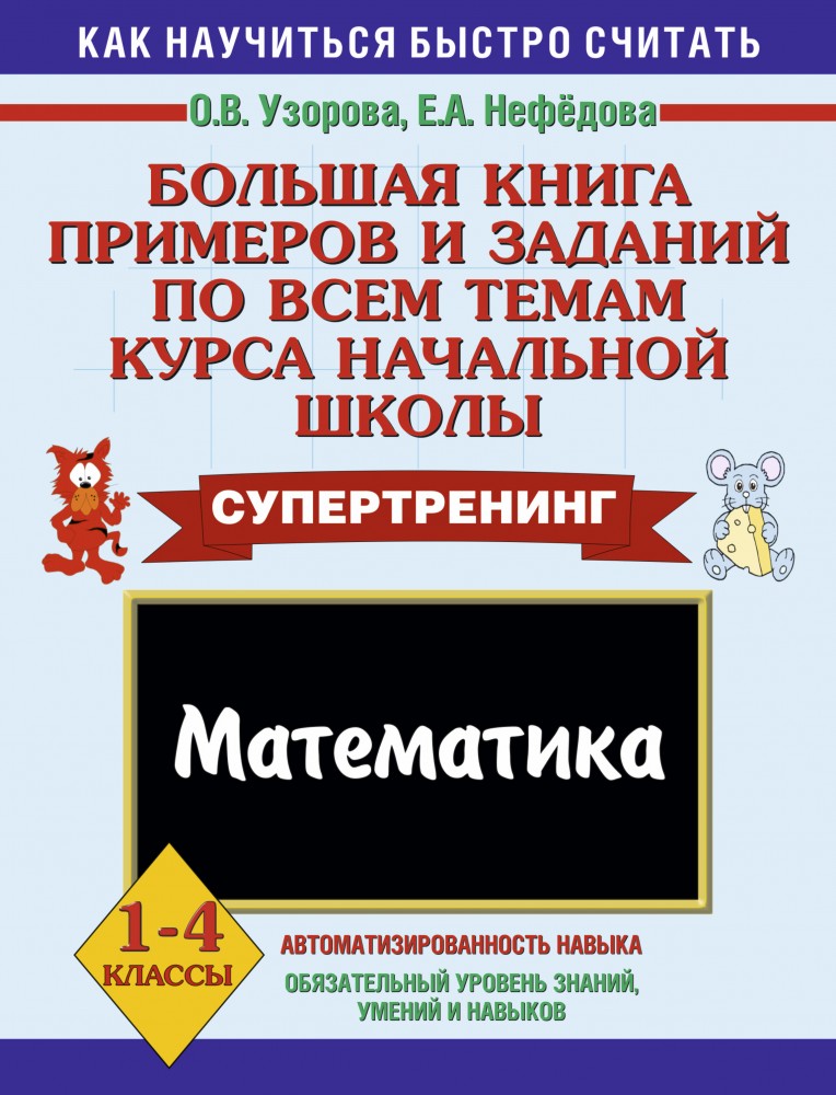 Большая книга примеров и заданий по всем темам курса начальной школы. Математика. 1-4 классыОльга Васильевна Узорова, Елена Алексеевна Нефедова В данный момент этот товар отсутствует в продаже. Возможно, у нас найдется аналогичный или похожий товар здесь. Серия: Как научиться быстро считать Перед вами уникальное пособие по обучению школьников навыкам устного счёта. В нём объединены примеры и задания по всем темам курса математики для начальной школы. Пособие состоит из 56 разделов, каждый из которых посвящен отдельной теме. Раздел состоит из трех частей: - Примеры для отработки навыков счета на скорость. На странице приведено 5 столбиков по 35 примеров в каждом. В конце столбика записывается время, потраченное учеником на решение. В левом нижнем углу обозначены контрольные цифры: идеальное время решения одного столбика, удовлетворительное и результат, который должен заставить ученика задуматься. Как показывает практика, ученик полностью усвоил тему, если решает пример и записывает ответ в течение 4 - 7 секунд. В этом случае можно говорить, что навык счета доведен до автоматизма. - Логические примеры. Выполнение этих заданий развивает логическое и математическое мышление, память и внимание. По усмотрению учителя примеры можно использовать как для олимпиадных работ и заданий повышенной сложности, так и для повторения и закрепления пройденной темы. Контрольные и проверочные работы. С их помощью учитель сможет быстро оценить полученные учениками навыки вычислений и выявить "слабые" места. Пособие можно использовать в качестве дополнительного материала на уроках математики, а также для занятий дома. |