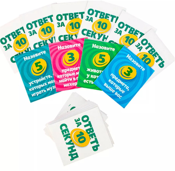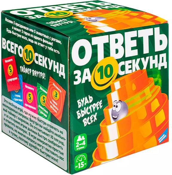 💳 Оплатить за товар можно при получении 🇰🇿 Есть бесплатная доставка по Казахстану от 1 дня 🎁 Копите бонусы с каждой покупки Настольная игра позволит весело и интересно провести совместный досуг с друзьями и в кругу семьи. Назови 5 супергероев, или 5 животных с рогами, а может 3 героя из одного и того же фильма! Будь быстрее всех, ведь на ответ у тебя есть всего 10 секунд! Это весёлая игра, где нужно быстро отвечать на неожиданные вопросы. Внутри вы найдёте необычный таймер с шариком. Он отсчитывает 10 секунд и за это время игрок должен быстро сообразить и ответить на вопрос. В игре невероятно простые правила, но многие вопросы могут поставить вас в тупик. Как только шарик достиг финиша — время для ответа истекает, поэтому думайте быстрее всех! |