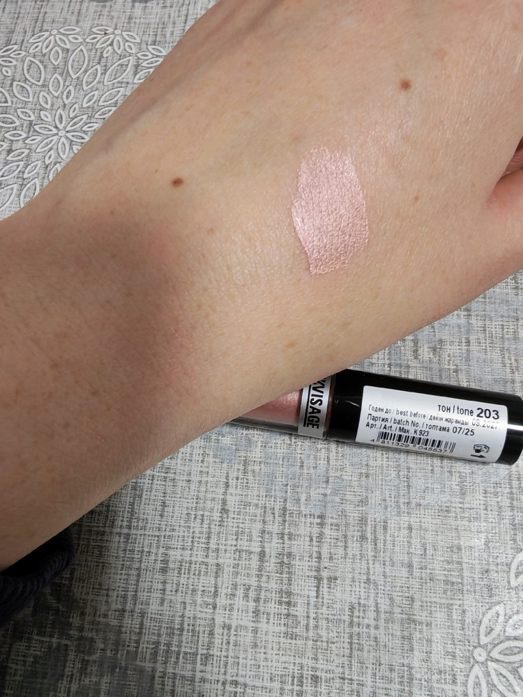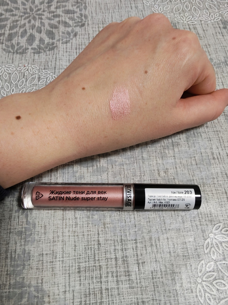 Цвет ненасыщенный, есть мелкие блёстки, которые на солнечном свету заметны. Хоть я и взяла один из тёмных оттенков, на моих веках он вообще незаметен, сливается с кожей.