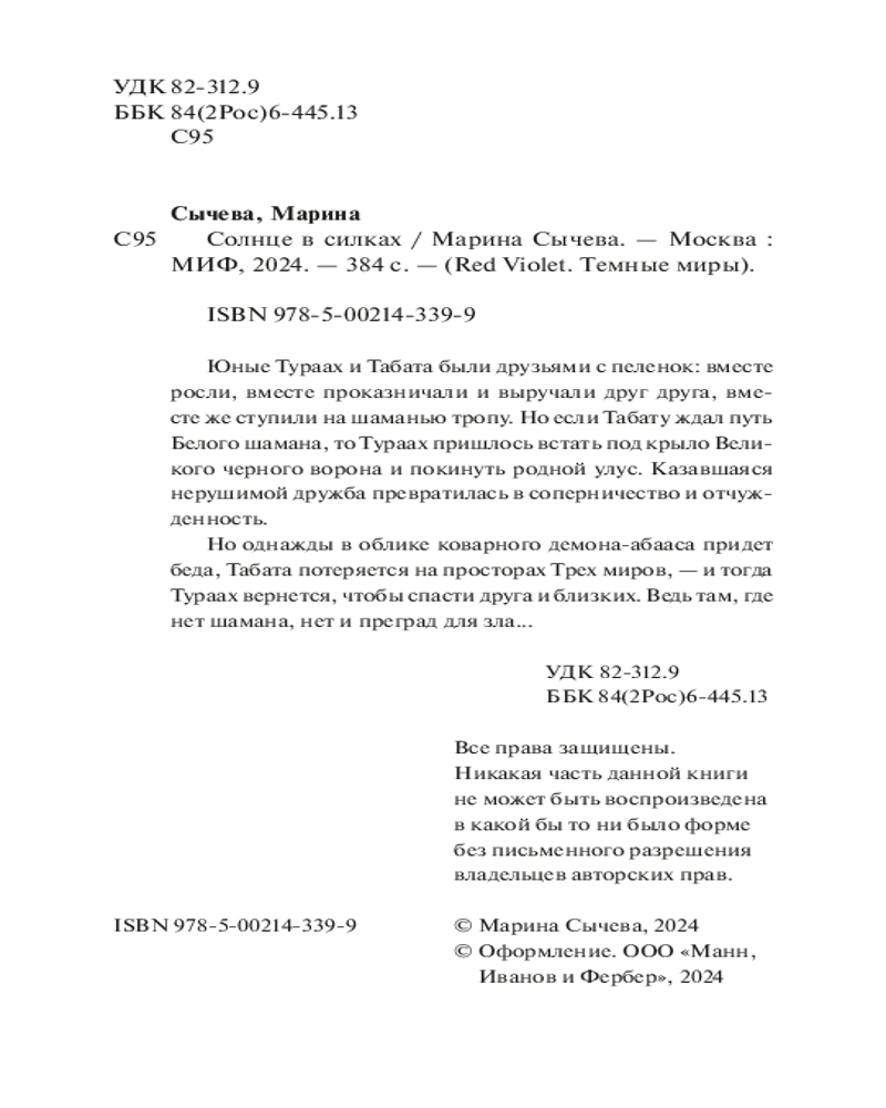 Солнце в силкахВ данный момент этот товар отсутствует в продаже. Возможно, у нас найдется аналогичный или похожий товар здесь. Серия: Red Violet. Темные миры Тураах и Табата всю жизнь были неразлучны: вместе росли, вместе играли, вместе встали на шаманью тропу. Тропа же их и разводит: дружба сменяется соперничеством и завистью. Обретенная сила — огромное испытание. Смогут ли Тураах и Табата принять ее и не потерять себя, следуя по пути шаманов? Перед вами этническое фэнтези на основе якутского фольклора, воплощенная любовь к Северу. Бескрайняя тайга, населенная духами-иччи, трескучие морозы, коварные демоны-абаасы, отважные люди и шаманы, связующие миры, подобно великому древу. Но так ли просто уместить в себе шаманское и человеческое? |