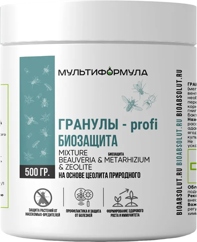 Гранулы-profi Биозащита — это инновационный, экологически чистый, пористый, влагоемкий, стерильный субстратный компонент на основе природного цеолита вулканического происхождения, имеющий сбалансированный природный состав макро- и микроэлементов, а также дополнительно обогащен спорами грибов Metarhizium anisopliae subsp.atis, Beauveria bassiana subsp.vivus.